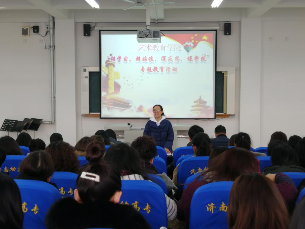 为全面提升广大教职工的政治意识、规矩意识、纪律意识、看齐意识,切实贯彻落实上级教育部门和我校党委关于开展“强学习、提站位、深反思、促整改”专题教育活动的精神和要求。艺术教育学院于2月24日在初等教学楼十一阶梯教室开展“强学习、提站位、深反思、促整改”专题教育活动。学院全体教师参加学习。