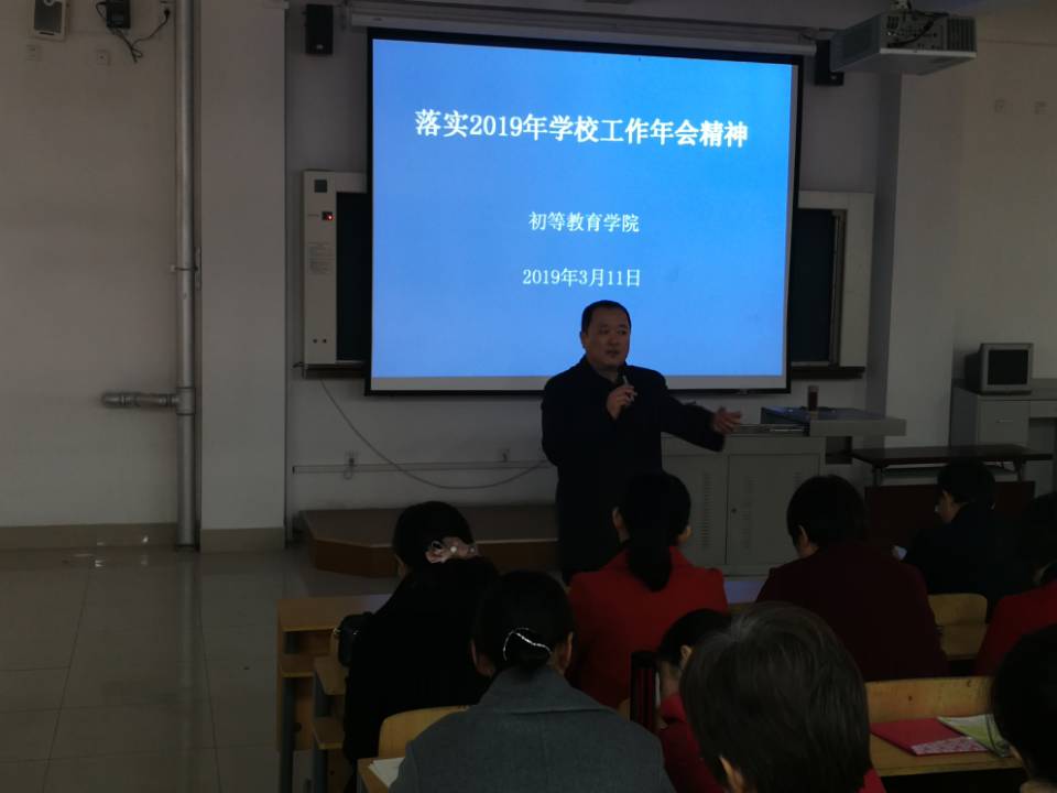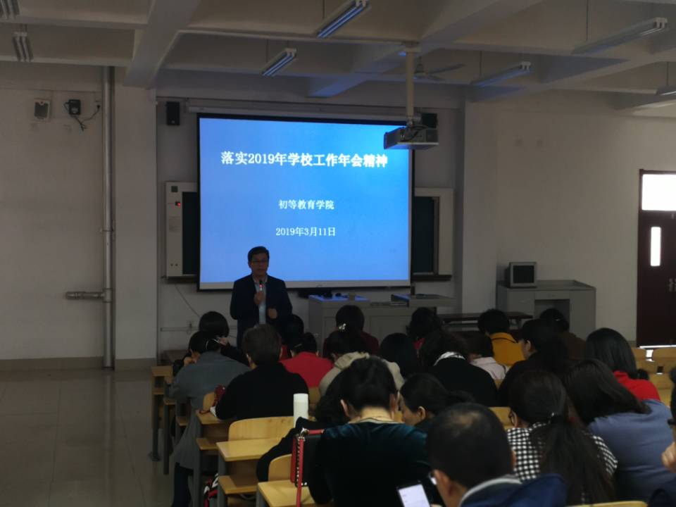 3月11日中午,初等教育学院在阶梯教室三召开全体教职工大会,落实2019年学校工作年会精神,结合开学以来学院各项工作的开展情况,就学院本学期各项重点工作梳理、布置。会议由院长袁道颐主持。