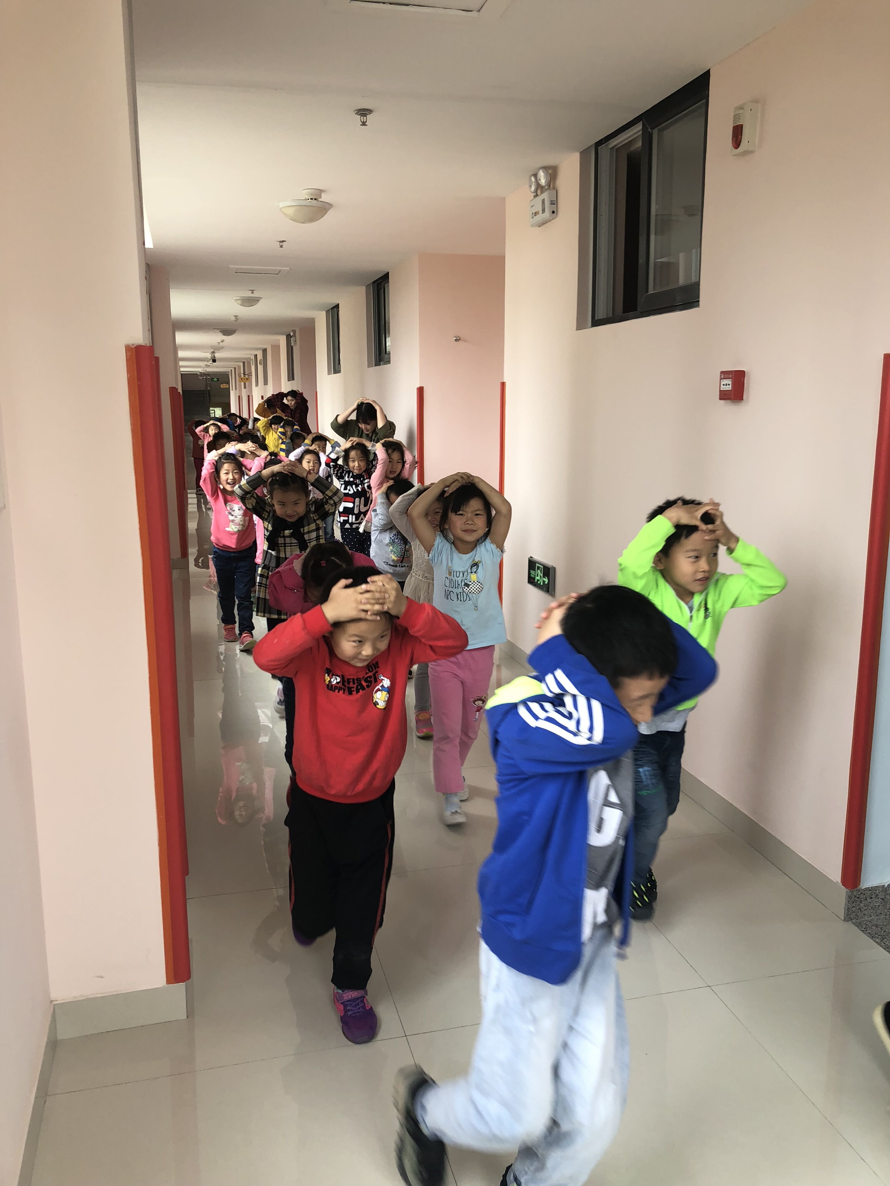 整个演练以班级为单位,组织幼儿学习安全避险知识与疏散撤离、自救互救的技能,并进行就地避震和安全撤离演练的讲解。随着“防震报警器”响起,幼儿在老师的组织下就近蹲或趴在桌子旁或承重墙的墙根、墙角;用手保护好头部,蜷曲身体,降低身体重心,避开窗户、吊扇,避免被砸,避险动作30秒,待警报解除后师幼开始向操场按照疏散路线有秩序地撤离。全体幼儿撤出教学楼后,操场整队集合,听从园长统一指挥。同时各班马上清点人数,检查受伤情况并逐级向园长报告,园长对本次疏散演练进行总结。
