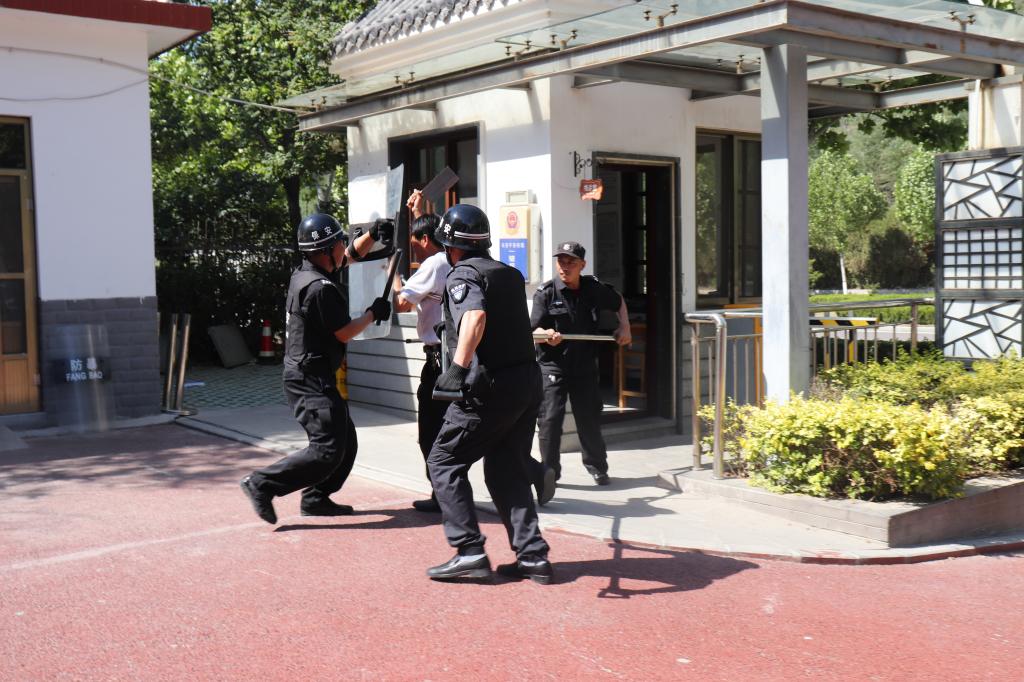 在演练之前,每个班级都进行了防恐演习的安全教育活动,5月23日下午2点40分,幼儿园正在进行常规户外活动,忽然,一名男子无接送卡,说不清楚孩子所在班级。保安上前盘问,“歹徒”不顾保安、门卫的劝阻,突然拿出器械硬闯入园,危机一触即发……