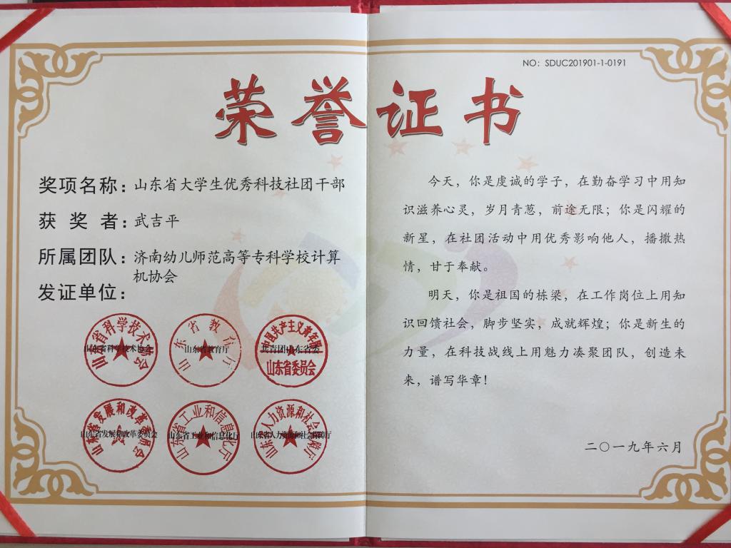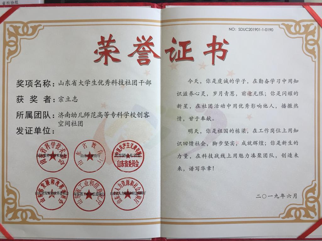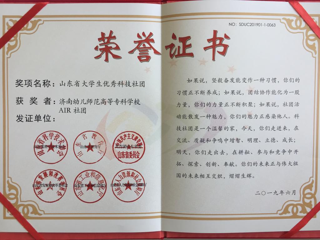 在山东省科学技术协会组办的2019年山东省大学生优秀科技社团和优秀科技社团干部评选活动中,我校“AIR”社团被评选为“山东省大学生优秀科技社团”,我校学生宗立志、武吉平被评选为“山东省大学生优秀科技社团干部”。我校将以此为契机加强对科技社团的管理和指导,提高科技社团活动质量,发挥科技社团在创新创业教育中的引领作用,开拓我校创新创业大赛新局面。