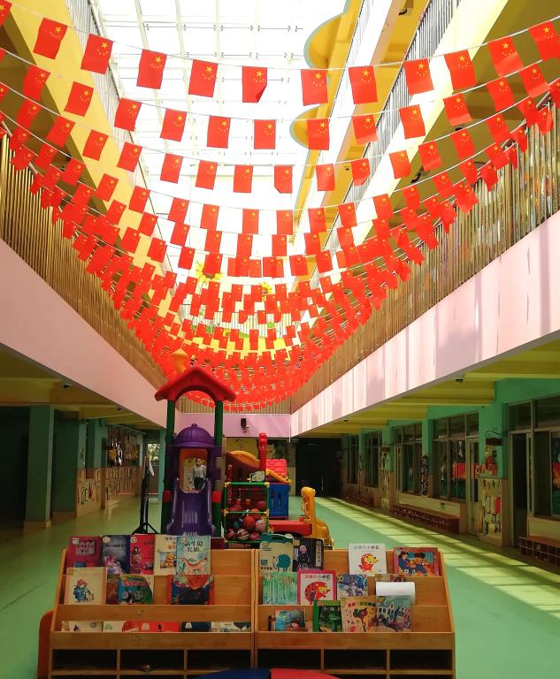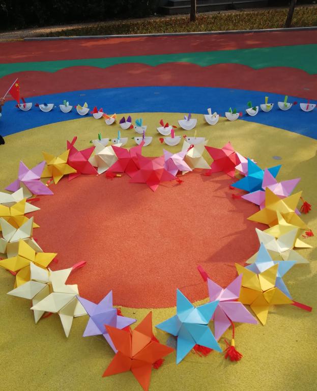 为了渲染节日气氛,让幼儿充分融入到庆祝活动中去,幼儿园开展了一系列的主题活动:首先 老师们积极创设了环境,在幼儿园的大厅、操场等挂满了国旗,满眼的中国红让孩子欢呼雀跃;其次、全体教职工、幼儿举行了一次升国旗活动,当五星红旗迎风飘扬的那一刻,大家深深感到了做为一名中国人的光荣和自豪。最后,各年级组的老师们带领孩子们制作了象征和平的和平鸽、立体五角星挂饰等小礼物,为祖国庆生。