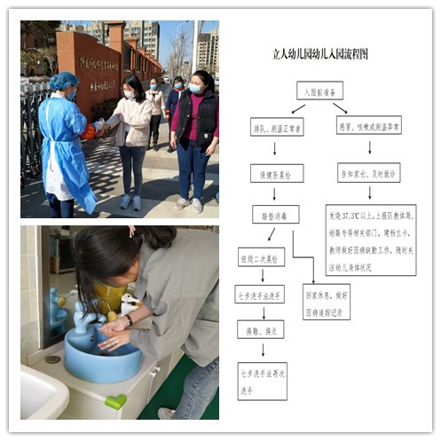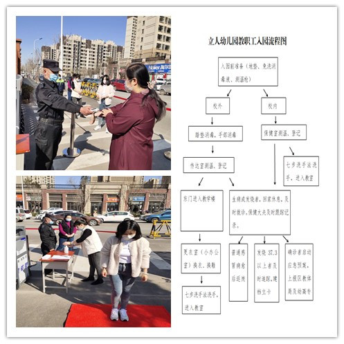 教职工入园时,先对教职工进行体温测量、踏垫消毒并登记、更换衣物、口罩后方可入班,进行七步洗手法后开始各项保教工作。