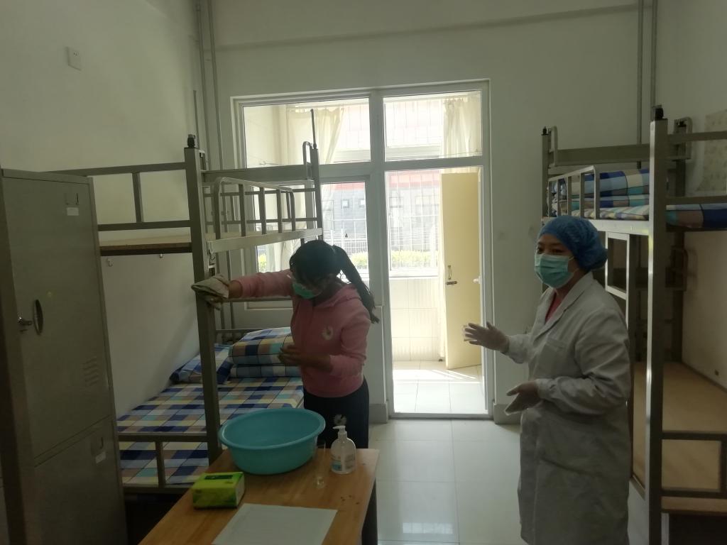 上午九时整,模拟演练正式开始,一号公寓、三号公寓、男生宿舍分别进行演练,参加演练的公寓管理员根据演练方案和操作流程,认真做好体温测量、身份核验、留置观察、登记报告、运送患者、环境消杀等各项应急处理工作。随后,学校校医韩寅玥大夫并对消毒液的规范使用、消毒重点位置等方面进行了详细讲解。