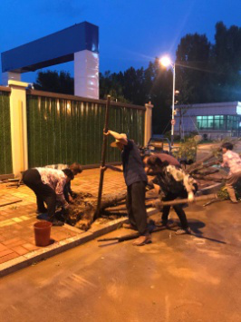 灾情发生后,总务处干部职工立即行动起来,带领外服单位服务人员积极投身到救灾工作中。维修人员第一时间到楼顶加固盖板,绿化人员对倒地树木进行扶正,伐断断裂树枝疏通道路,对损坏门窗进行抢修。
