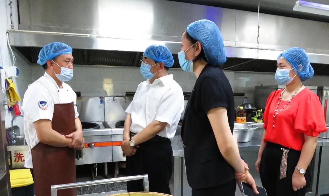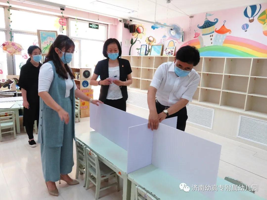 武书记一行严格按照入园防控流程进园,在王芳园长等幼儿园领导班子陪同下先后对幼儿园12个班级活动室、食堂、操场、花园、三楼平台等进行了实地查看,就幼儿园防疫工作、开园准备、幼儿安全、食堂管理等方面进行了全方位细致了解。实地查看过程中,武书记对正在辛勤工作的老师们表达了亲切关怀与慰问,对全园教职工在疫情防控、复园准备工作中的辛苦付出表示感谢;看到各班为幼儿就餐准备的创意环保隔板时提出了高度赞赏,充分肯定幼儿园节俭、精细的工作作风。