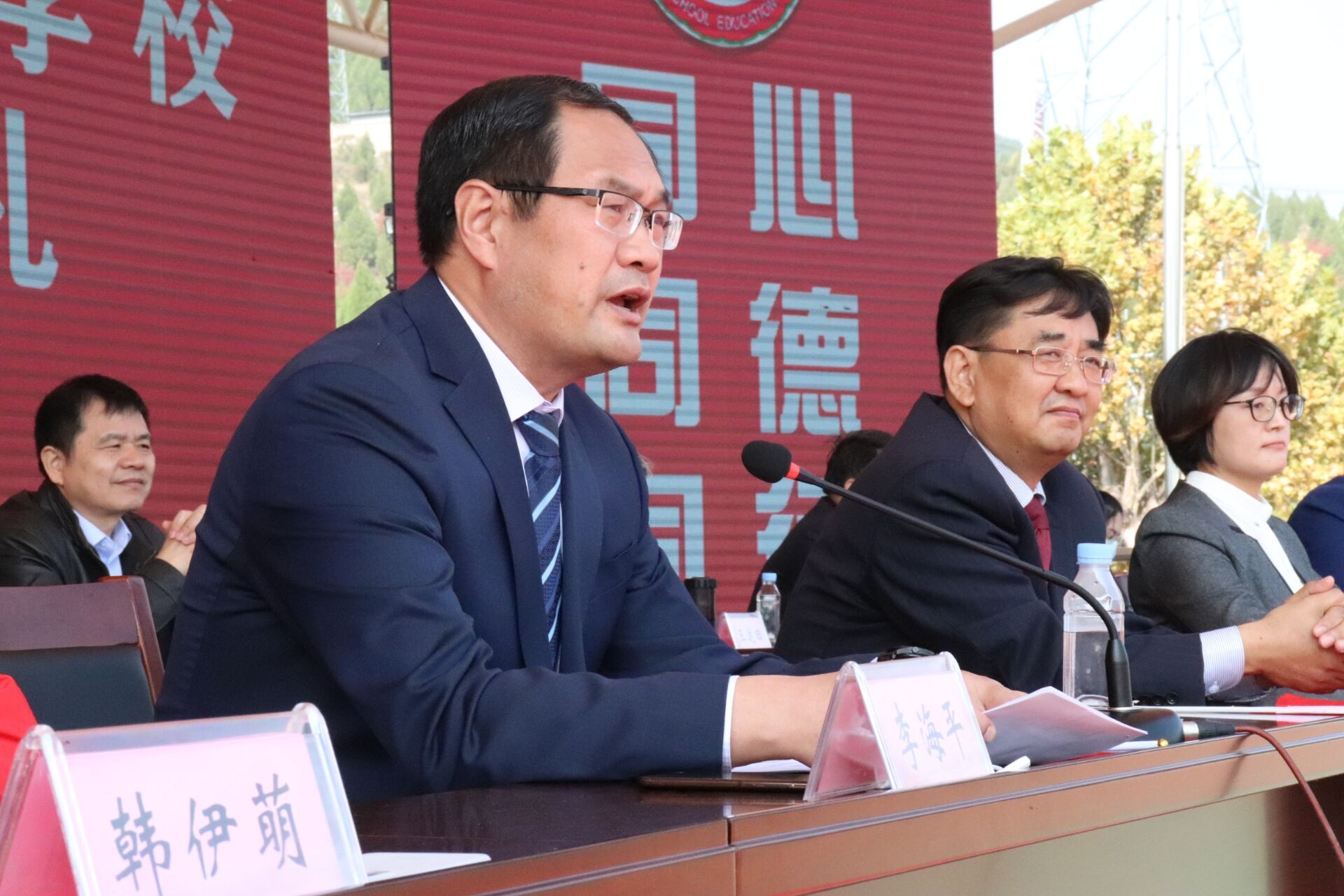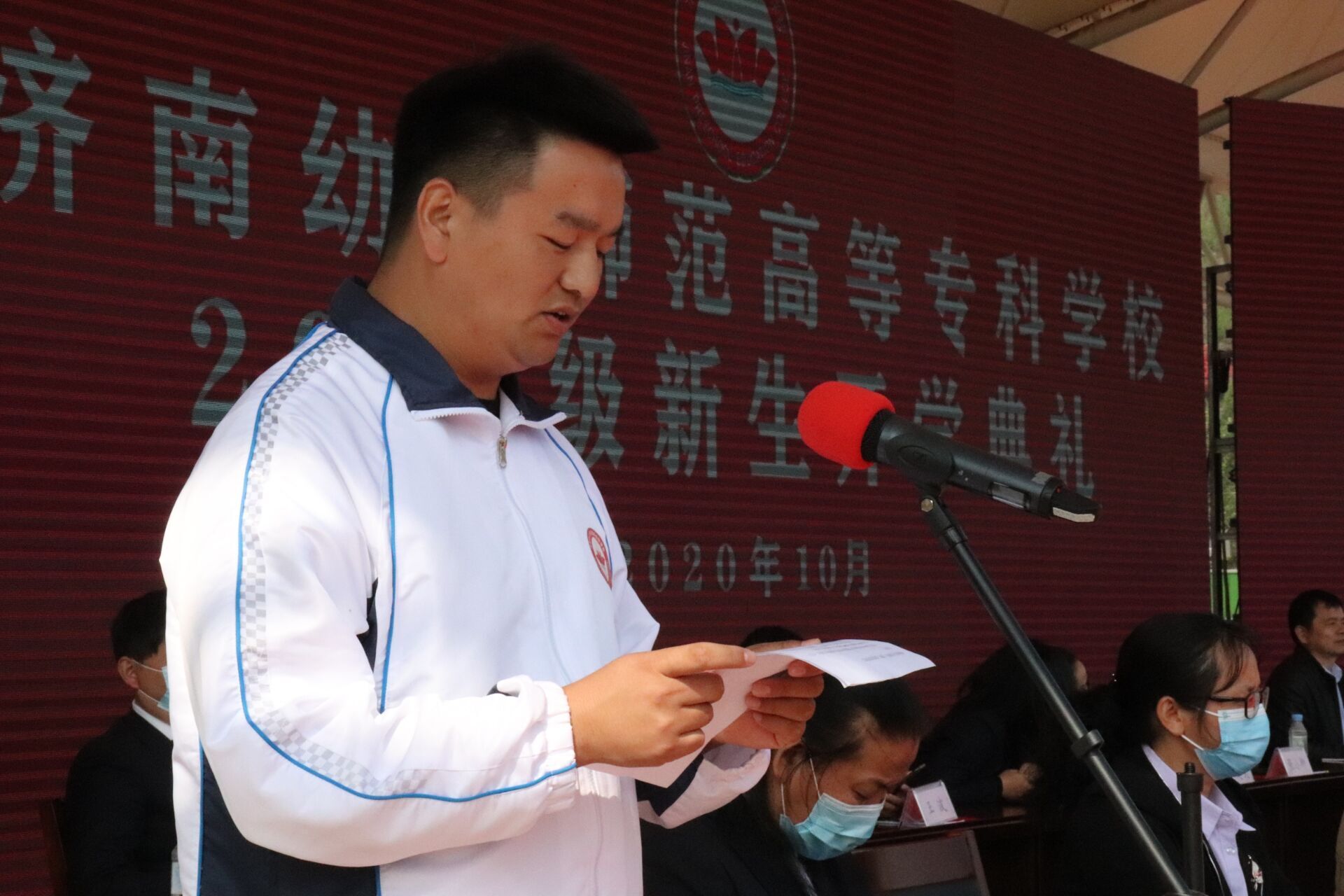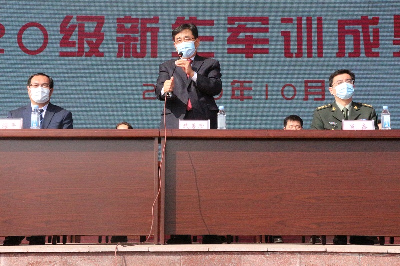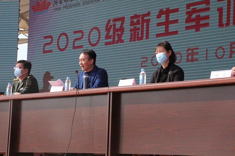 天高云淡,秋风送爽。10月18日上午,我校2020级新生军训成果汇报暨开学典礼在长清校区田径场隆重举行。济南市长清区武装部副部长肖鑫、山东大学幼教服务中心主任张卫东、济南市中心医院急诊科护士长李伟、学校党委书记武善欣、校长李海平、副校长丁家德、张传银、崔建以及各学院(处室)负责人、优秀校友代表等出席了仪式,新生班主任、辅导员和2020级全体学生参加了典礼。典礼由副校长崔建主持。