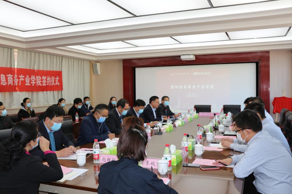 10月23日下午,我校慧科信息商务产业学院签约揭牌仪式在长清校区第一会议室举行。党委书记武善欣、校长李海平、副校长崔建与慧科教育科技集团有限公司共同创始人CEO岳喜伟、副总裁徐功东、环海区运营总监吴浩贞等出席。会议由副校长崔建主持。