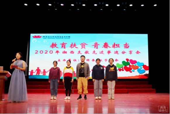 教育扶贫,青春担当。为弘扬志愿服务精神,强化立德树人使命担当,引导青年学生践行社会主义核心价值观,厚植家国情怀,全面展示我校湘西支教学生的风采,近日,校团委在演播厅进行2020年湘西支教先进事迹分享会。来自五个学院共计二百余名团干部培训班学员聆听了此次分享会。