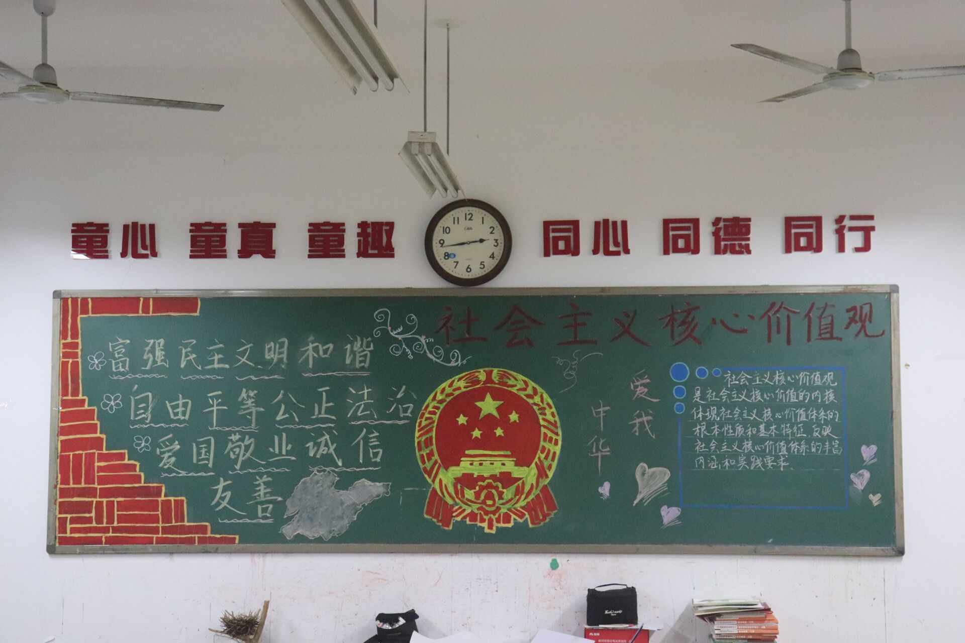 班会中,围绕核心价值观内容开展活动。有的班级讲述了名人英雄事迹,激起同学们强烈的爱国主义情怀;有的班级以“爱国”为切入点,引导同学们思考,展开讨论;有的班级穿插现实生活中的真实案例,向大家讲述了对社会主义核心价值观的理解。同时也通过黑板报的创意绘制,积极引导同学们全面认识和正确理解核心价值观的基本内容,让社会主义核心价值观深入人心,永驻校园。