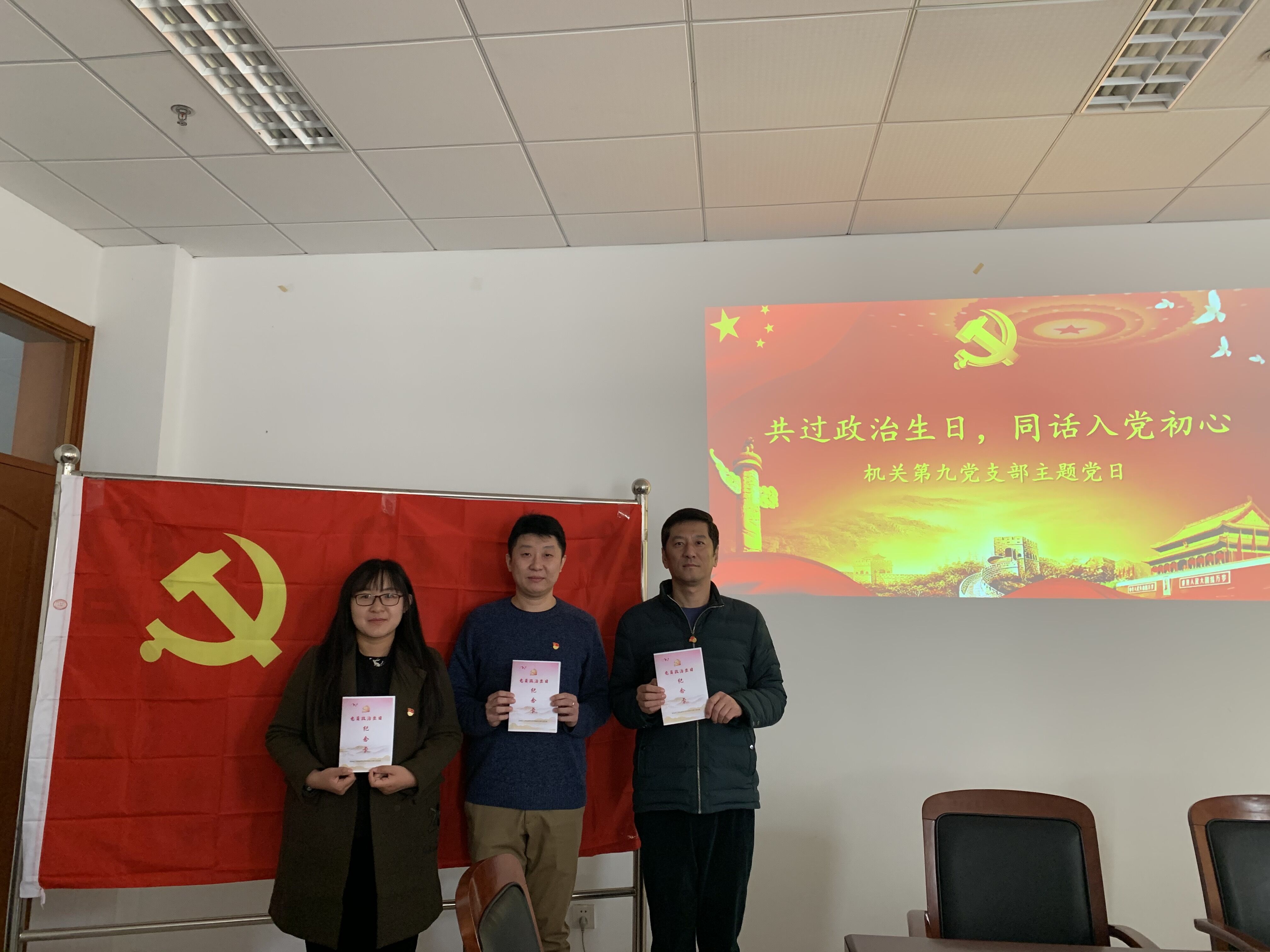 11月25日上午,在机关第九党支部开展的“共过政治生日,同话入党初心”主题党日活动现场,张欣欣、谢天、黄健接过了支部书记章慧同志颁发的政治生日纪念卡。这三位党员当年分别以学生、军人、教师的身份加入党组织,活动中他们与大家分享了当初入党时的感想,追忆入党初心,交流成长经历。大家纷纷表示,入党多年还是第一次过政治生日,组织给大家过这样一次特殊且有意义的生日,既深刻感受到了党组织的关怀和温暖,也是对自己的一次党性再教育,提醒着大家时刻牢记党员身份,在工作岗位上认真履职,努力工作,践行入党时的铮铮誓言。随后,全体党员面向党旗,再次重温入党誓词,交流参加此次主题党日活动的感想。