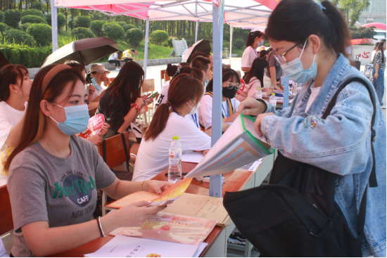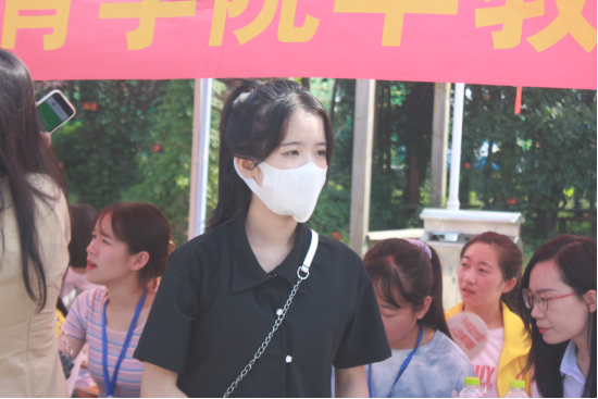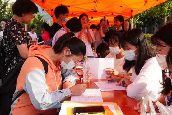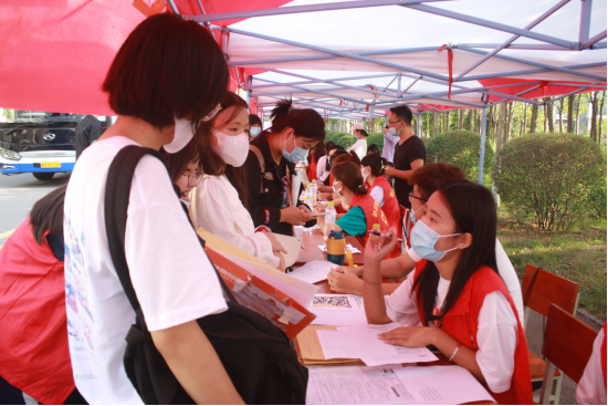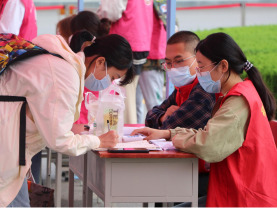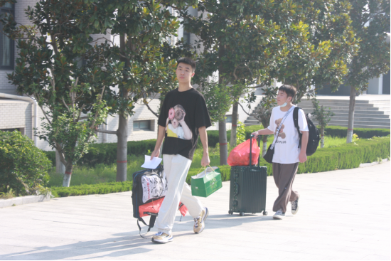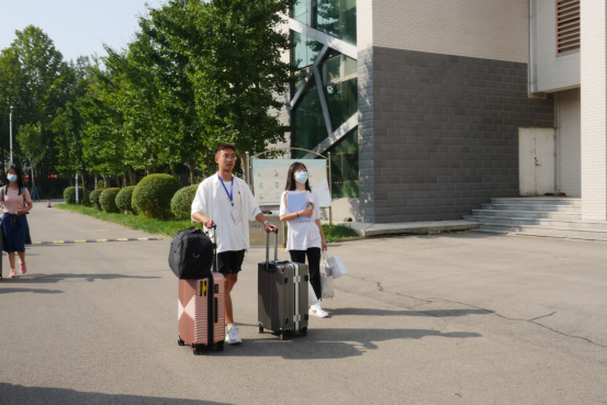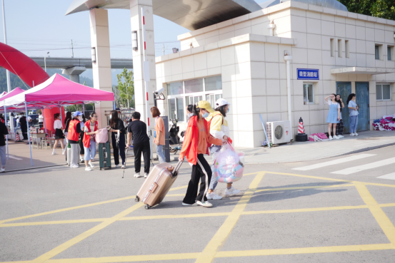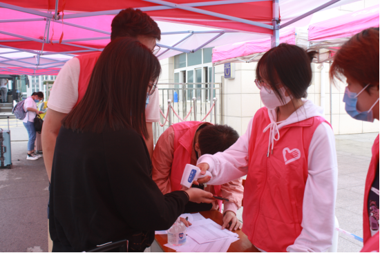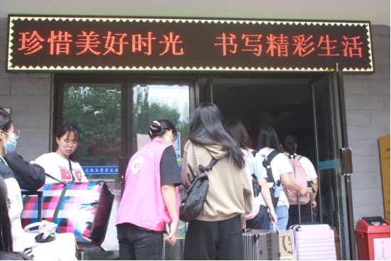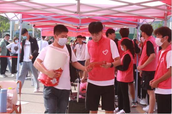 志愿者们为新生测量体温,核实信息,报到登记,搬运行李。