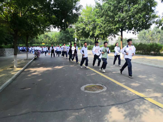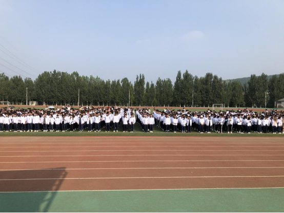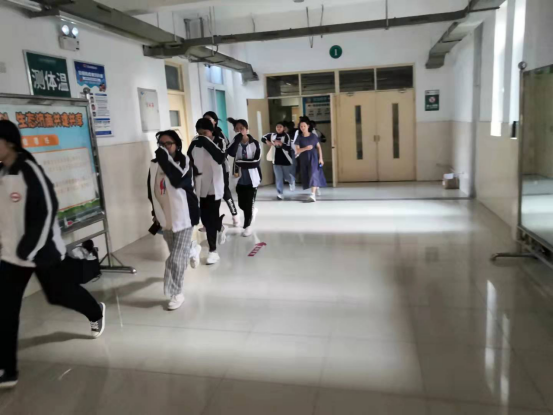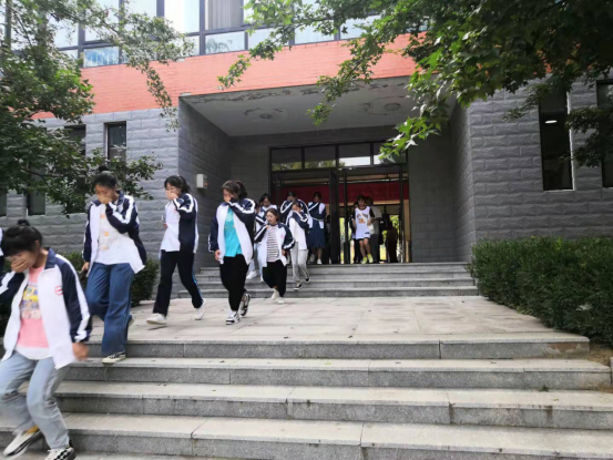 全体新生弯着腰,捂住鼻,按照各班级分配的最近安全路线撤离,赶赴运动场安全区域集合等待。