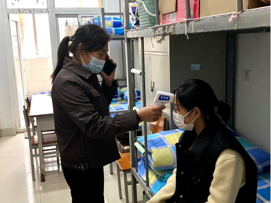 此次演练主要模拟学生在宿舍出现发热情况的全过程处置,包括了入楼测温、发现疑似病例、情况上报、留观点观察、安抚密切接触学生、消毒处理、校医初步判断后启动应急程序上报等流程。
