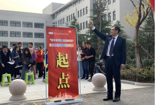 本次“奋斗百年路,启航新征程”红色主题定向越野比赛由党委书记李海平发令。今年是中国共产党成立100周年,本次红色定向越野将地形图设置为“100”字样的图形, 参赛选手需手持地图,按顺序依次打卡经过藏在100图形中的各点位,完成“党史知识问答”与游戏“永不消逝的红色电波”。