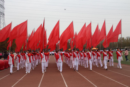 国旗护卫队庄严入场,各方队紧随其后,踏着坚定整齐的步伐、喊着铿锵有力的口号,气势高昂的通过主席台,展现出幼高专学子的风采。