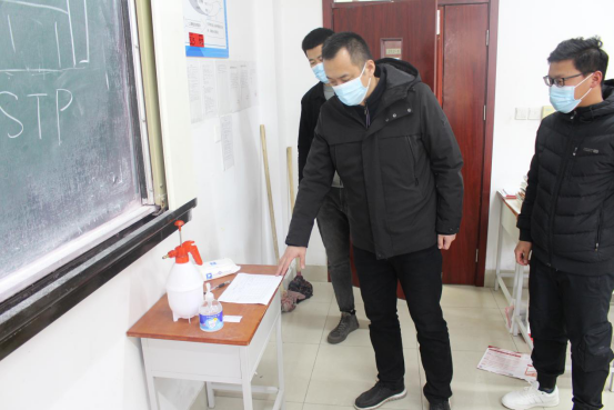 副院长程玉双对教师“四个一律”掌握情况进行了现场抽查,并对办公室、教研室疫情防控物资及通风消杀落实情况进行了检查。
