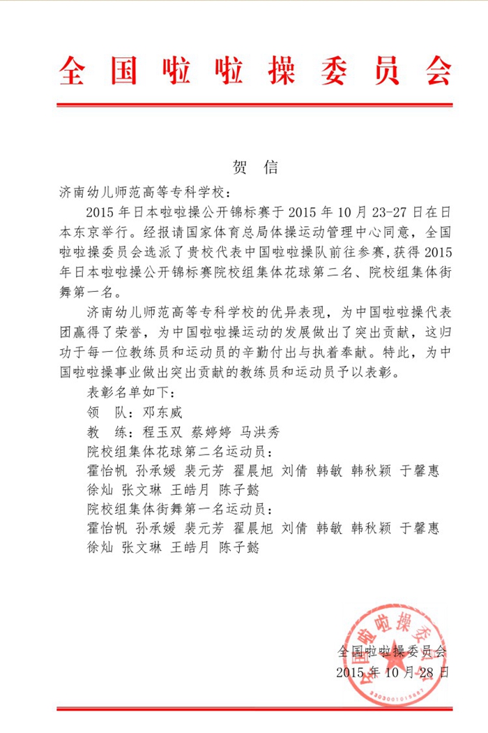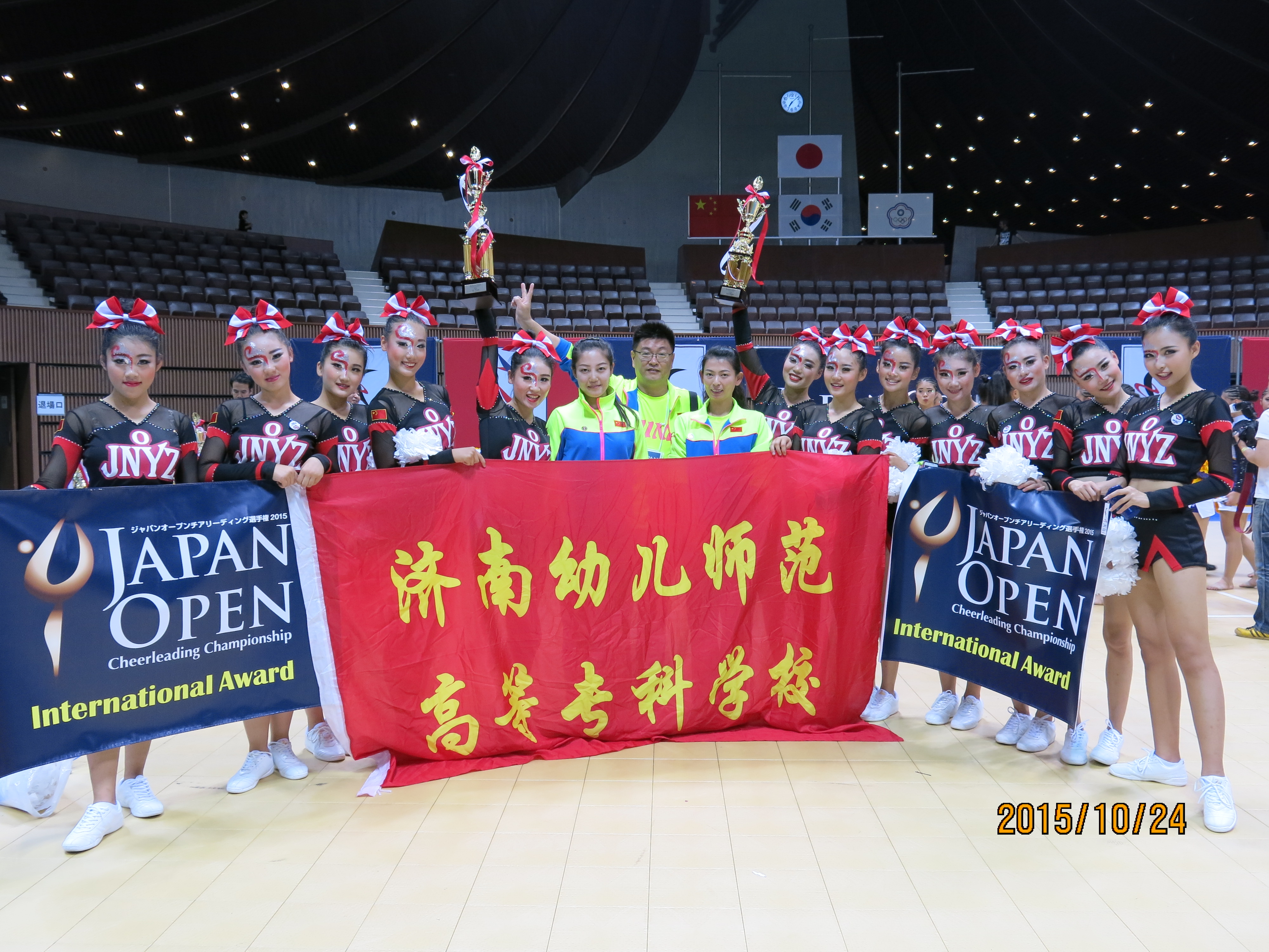 2015年10月23日,2015年日本啦啦操公开锦标赛在日本东京举行,参赛国家有中国、美国、意大利、日本等9个国家和地区。作为中国派出的代表队之一,我校啦啦操队的12名参赛队员,在领队邓东威老师和指导教师程玉双、蔡婷婷老师的带领下,在高手如云的国际比赛中顶住了压力,力压群雄,分别取得了街舞第一名和花球第二名的好成绩。(基础教育学院)