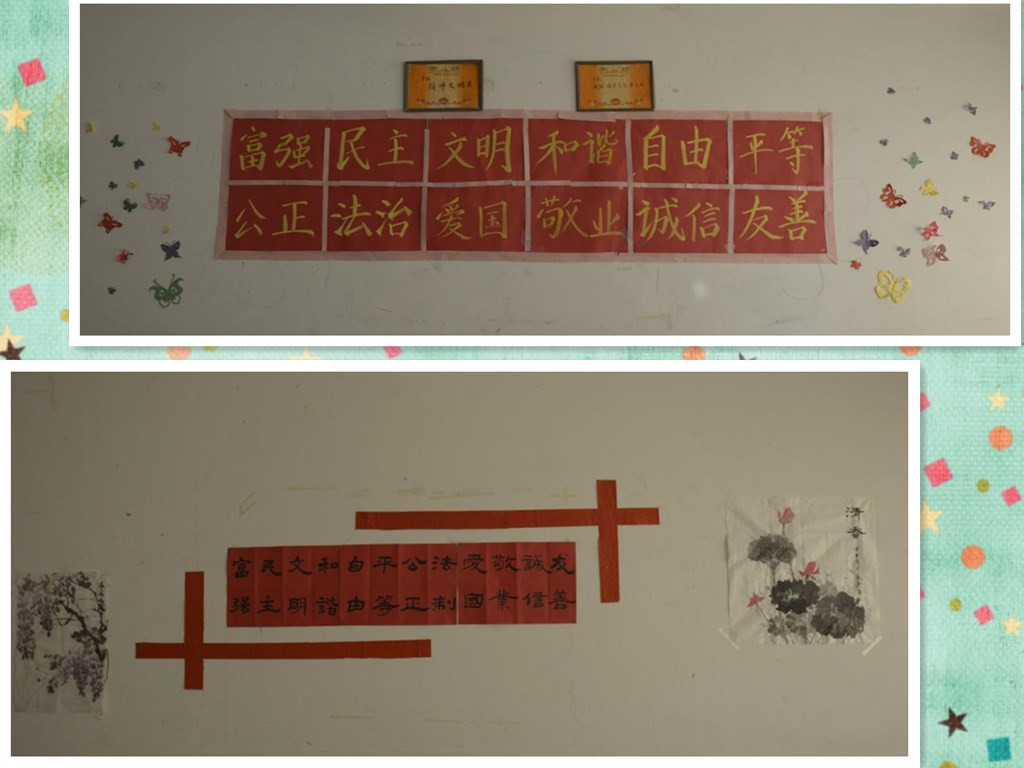 每个班级的环境建设内容都积极向上,突显专业特点。美术班的教室里挂有同学们优秀的油画、国画作品和手工作品;音乐班教室里有跳动的音符,舞动的剪影。“相亲相爱”的照片墙上有同学们团结友爱在一起的精彩瞬间;“理想树”、“梦想藤”上有同学们的梦想和前进的方向;教室里张贴出的社会主义核心价值观24个字,时刻提醒同学们要做新时代的“四有”青年。
