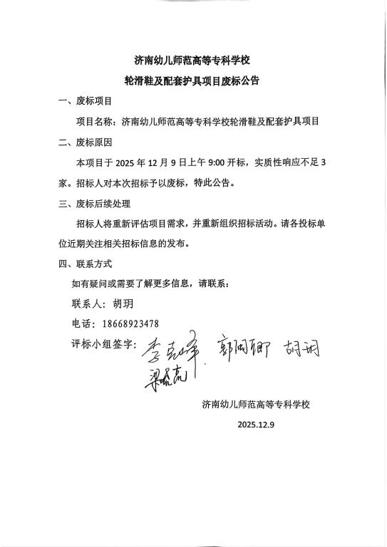 济南幼儿师范高等专科学校轮滑鞋及配套护具项目废标公告