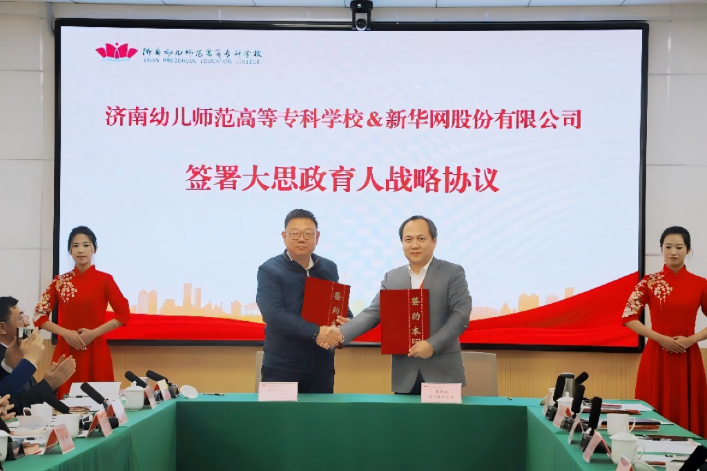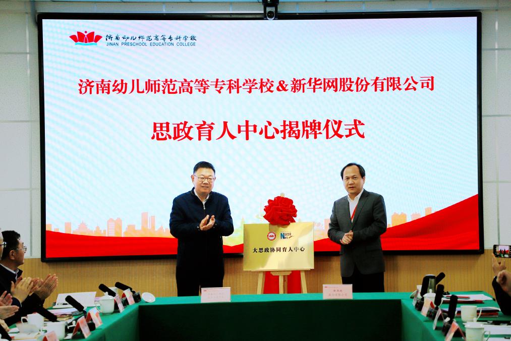 随后,会议进行新书发布与签约环节。山东人民出版社副总编辑邱明致辞并与刘海峰共同进行新书《一代风流——1919至1927山东济南学校走出的进步青年》的揭幕。新华网在线教育分公司总经理孟源致辞。在与会嘉宾见证下,济南幼儿师范高等专科学校与新华网股份有限公司签署大思政育人战略协议,共同为思政育人中心揭牌,标志着学校在构建资源共建、平台共享的新时代大思政育人协同机制上迈出重要一步。