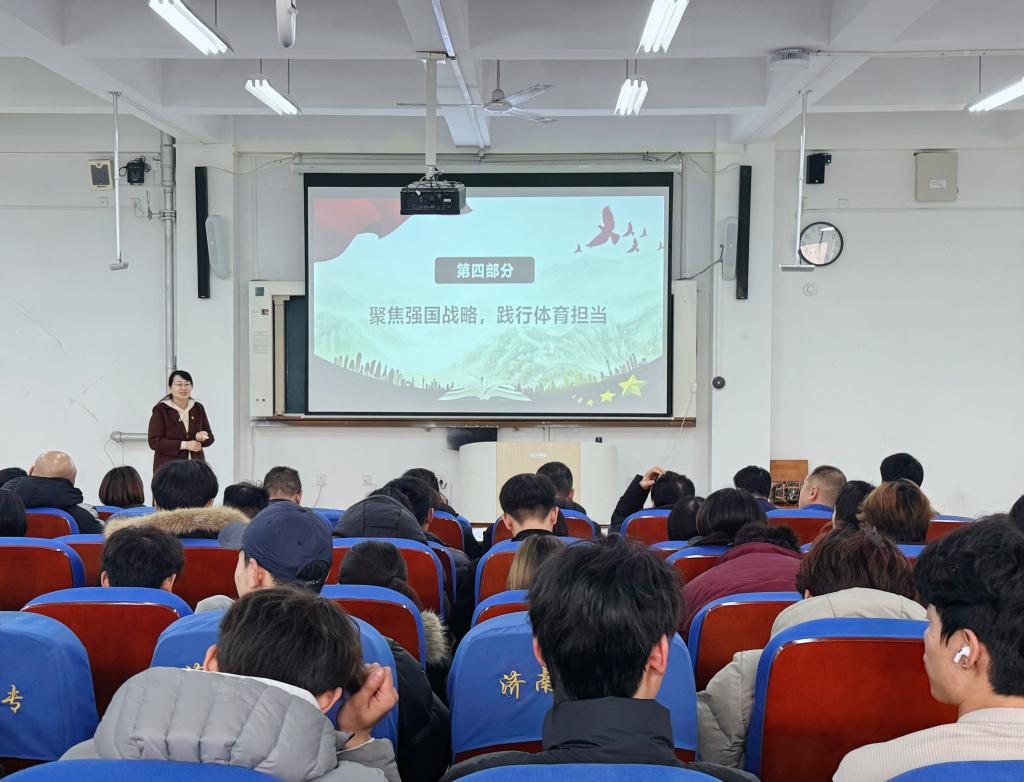 为深入学习贯彻党的二十届四中全会精神,引导我校广大师生将理论学习成果转化为推动学校高质量发展的强大动力。12月30日下午,王尽美思政教育学院“励新”宣讲团成员张嘉老师应邀走进体育学院,作《深学笃行党的二十届四中全会精神 以体育力量赋能中国式现代化》专题宣讲。体育学院领导班子、全体教职工及学生骨干代表来到现场参与本次活动。