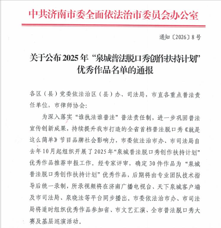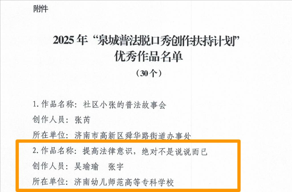 近日,中共济南市委全面依法治市委员会办公室与济南市司法局联合印发〔2026〕8号通知,正式公布2025年“泉城普法脱口秀创作扶持计划”优秀作品名单。我校王尽美思政教育学院教师吴瑜瑜、张宇共同创作的普法作品《提高法律意识,绝对不是说说而已》成功入选。