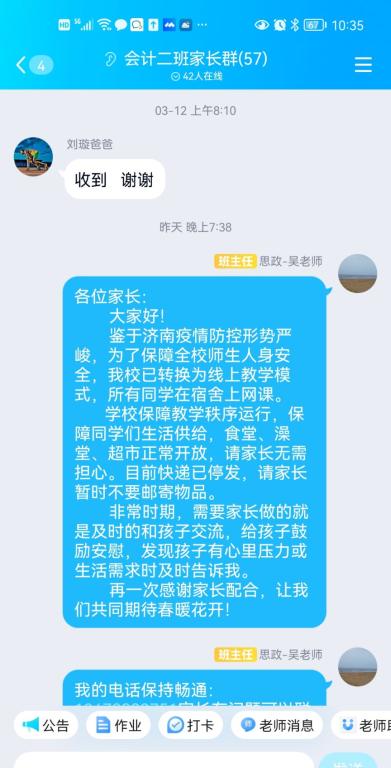 同时,所有班主任老师及时召开线上家长会,将济南市和学校疫情防控的情况向各位家长进行说明,实现了家校协同发展,使家长全面了解学生在校情况,让家长安心。