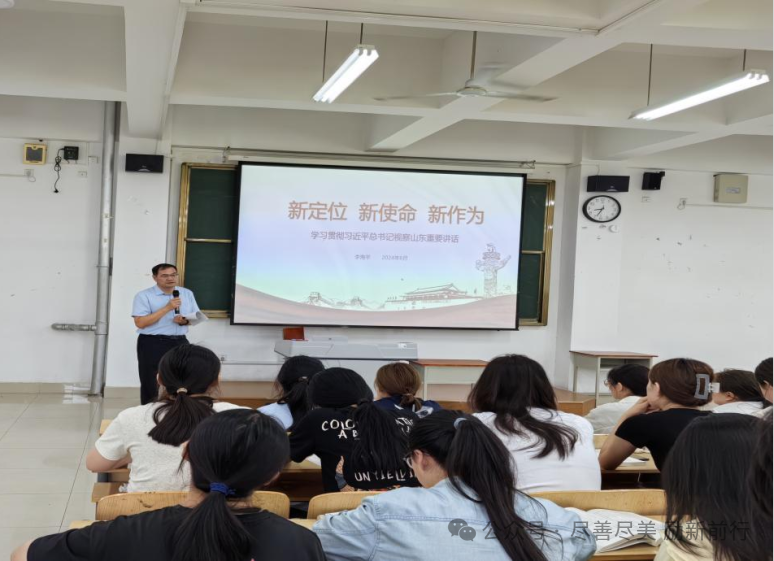 为深入贯彻落实习近平总书记关于学校思政课建设的重要指示精神,全面落实党的教育方针和立德树人根本任务。2024年6月27日上午,我校党委书记李海平来到初等教育学院,为2023级小学数学教育1.2班的学生们上了一堂题为《新定位 新使命 新作为:学习贯彻习近平总书记视察山东重要讲话》的思政课。初等教育学院党总支书记章慧、副书记刘恒、王尽美思政教育学院院长王蕾、副院长唐嫣以及部分辅导员和思政课教师参加了听课活动。