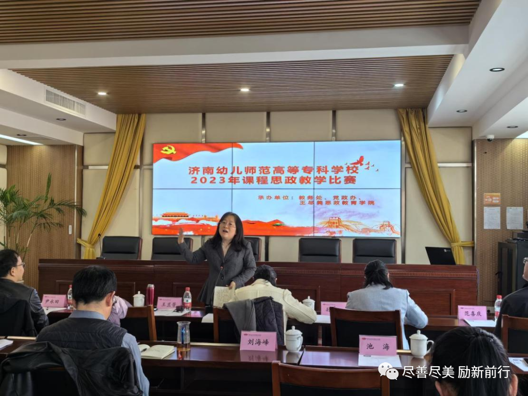 为深入学习贯彻习近平总书记关于教育的重要论述和全国高校思想政治工作会议、全国教育大会精神,贯彻落实《高等学校课程思政建设指导纲要》(教高〔2020〕3号)和《山东省教育厅关于深入推进高等学校课程思政建设的实施意见》(鲁教高字〔2021〕4号)等文件精神,全面推进课程思政建设,落实立德树人根本任务,强化课程育人导向,挖掘和丰富课程育人内涵,充分发挥课堂教学育人主渠道作用,打造一批课程思政示范课堂和教学名师,根据《济南幼儿师范高等专科学校课程思政建设实施方案》(济幼高专党字〔2020〕43号)、《济南幼儿师范高等专科学校2023年第二届“课程思政”教学比赛活动实施方案》,由校教务处、党政办以及王尽美思政教育学院联合举办的第二届2023年课程思政教学比赛于12月28日在学校行政楼二楼会议室正式开赛,本次比赛由王尽美思政教育学院副院长高衍玉主持,我校校长刘海峰、副校长崔建、纪委副书记刘焕、各学院院长现场观摩比赛。本次比赛的评审专家采用外聘专家和校内专家相结合的形式,邀请了山东交通学院曾梅教授、孙烨教授、山东师范大学王兰芳教授、山东中医药大学教务处副处长尹永田作为外聘专家评委,我校宣传统战部部长范喜庆作为校内专家评审。