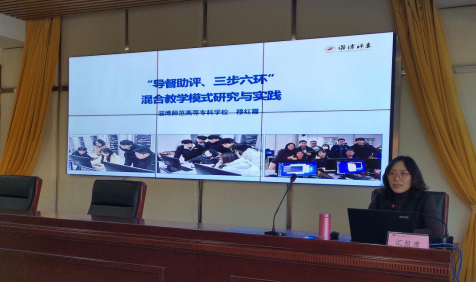 会中,邀请混合式教改领域专家、淄博师范高等专科学校穆红霞教授作“‘导督助评、三步六环’混合式教学模式研究与实践”的专题报告。穆教授结合淄博师范高等专科学校混合式教改项目的真实案例对混合式教学作出了深度的理论解读和具体的操作指导。