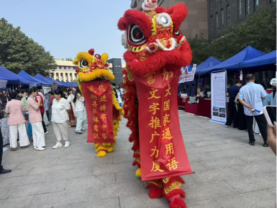 狮舞助兴,活力传声。体育学院刘鹏老师指导的龙狮运动社团,以一场气势恢宏的舞狮表演点燃现场气氛。表演当中舞狮展现出的横幅正是今年推普周的活动主题,将“加大国家通用语言文字推广力度,促进铸牢中华民族共同体意识” 的推普主题融入传统民俗展示,实现 “文化传播+语言推广” 的双重效果。