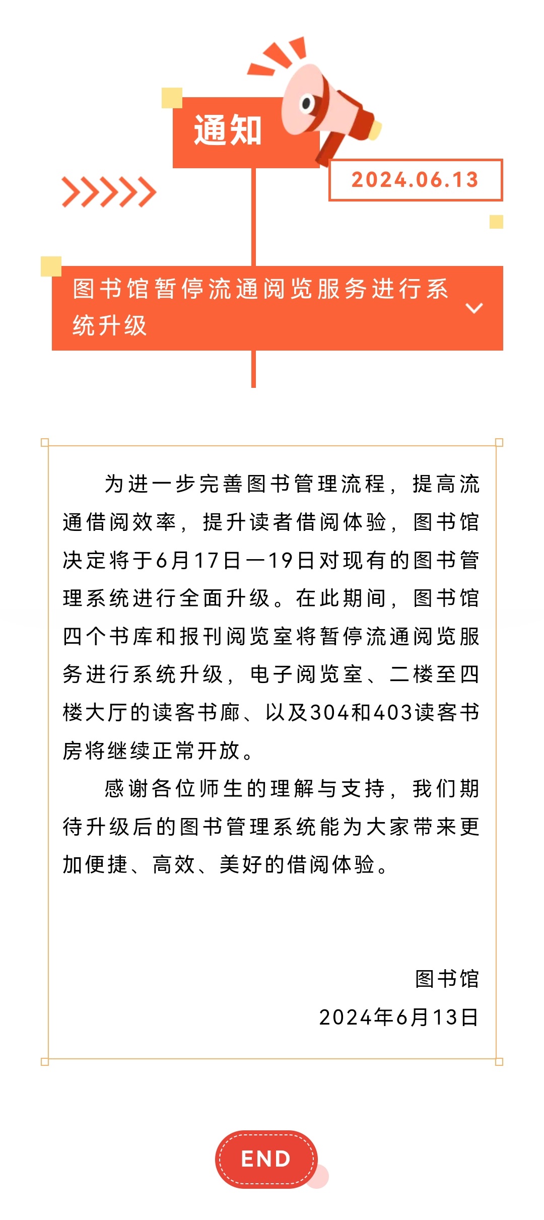 关于图书馆暂停流通阅览服务进行系统升级的通知