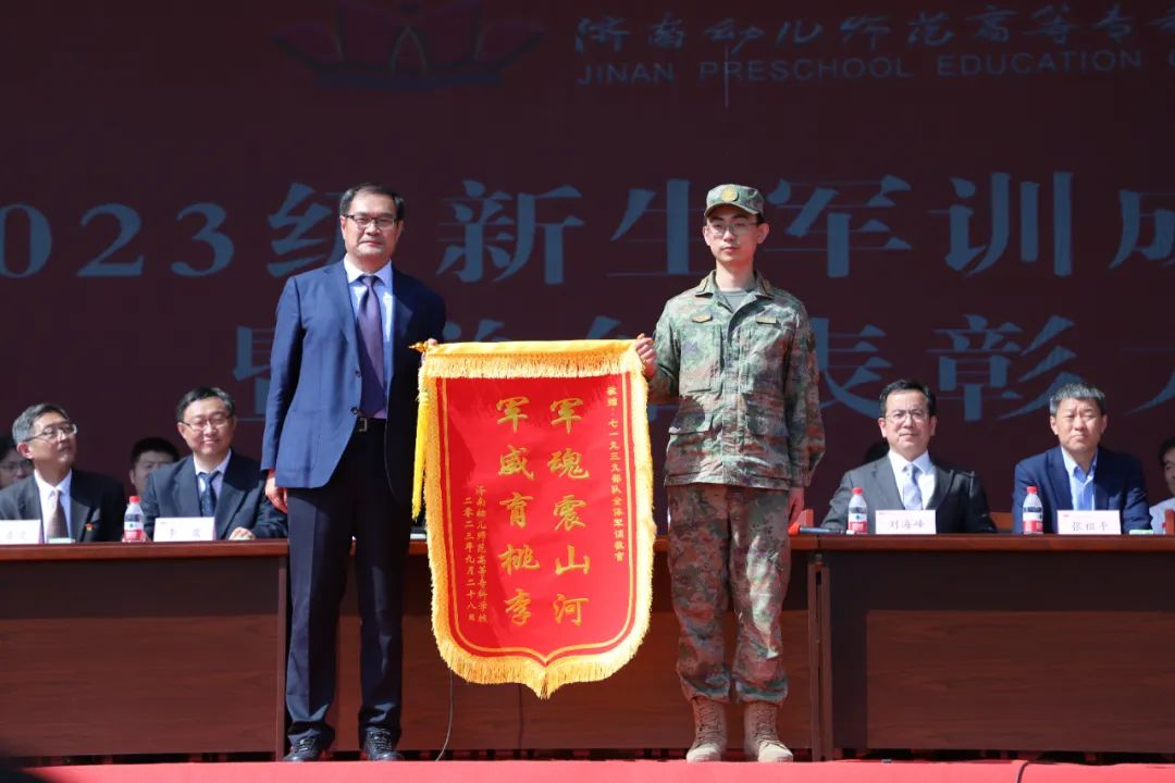 精彩的展示过后,副书记成刚宣读军训表彰决定。学校领导为荣获优秀教官、最佳连队、军训标兵、内务优秀宿舍集体和个人颁奖。颁奖仪式过后,李海平书记向军训团领导赠送锦旗,表达由衷的感谢。