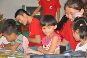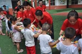 大家在观摩了幼儿园新进教师的公开课后,进入了志愿者与幼儿园老师、小朋友间的互动环节。志愿者将平日所学应用到本次实践活动中,大家一对一的和幼儿园小朋友开展了手工制作、讲故事、绘画和游戏活动,还在操场上举办了一场小型歌舞联欢会。孩子们天真的笑脸、可爱的动作,与志愿者们的歌声、掌