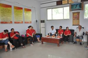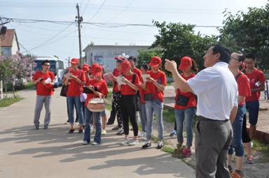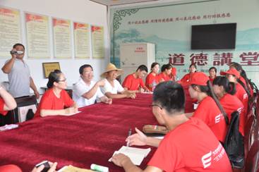 志愿服务团首先来到沂南县大庄镇官庄村。在镇宣传委员杨传启的带领下,服务团全体人员参观了大庄村的村容村貌,观摩当地善行义举“四德榜”、“四德歌”、“寿星光荣榜”、“70岁老人赡养明细表”等“四德工程”示范榜。在与村干部的座谈交流会上,村支部李云龙书记讲述了自己20年的村干部经历,新旧官庄村的发展对比,以及官庄村在新农村建设中取得的重大成绩,老百姓生活水平的提高和生活环境的改善。言谈话语中透露着老区人民的朴实与真诚,不仅鼓励在场的同学们要常怀感恩之心,感恩成长路上所有的人和事,还要在拼搏进取中历练自己,成就自己。在场的同学们深受鼓舞和感动,时不时发出由衷的赞叹与掌声,与李书记的讲话产生了强烈的共鸣。