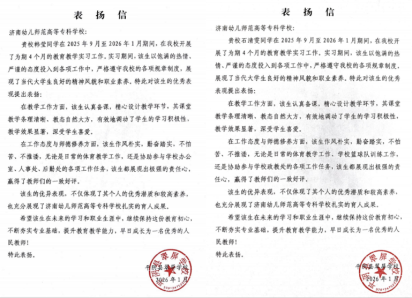 1月5日,体育学院收到平阴翠屏学校两封表扬信,对学院2023级体育教育专业学生韩莹、石清雯在4个月支教实习中的优异表现给予高度赞誉。两位学子以过硬专业能力、优良职业素养圆满完成各项任务,为实习学校体育教育注入新活力,生动印证了学院“德技并修、育体育人”的育人成果。