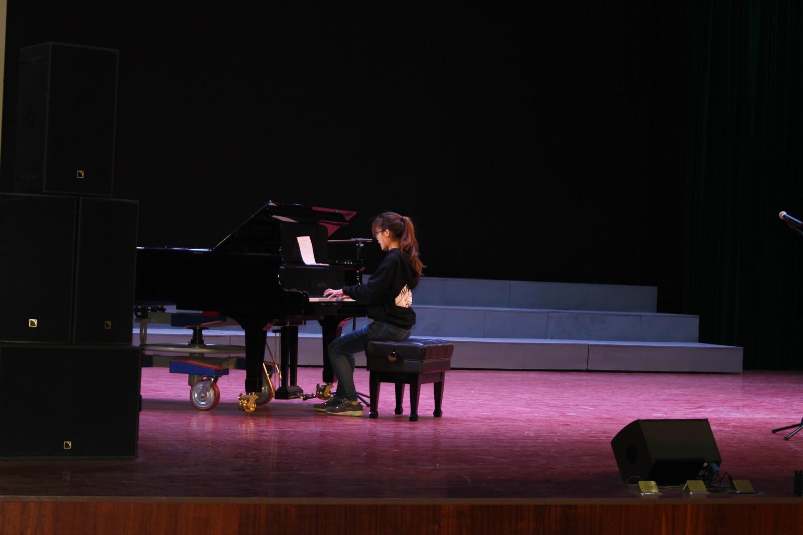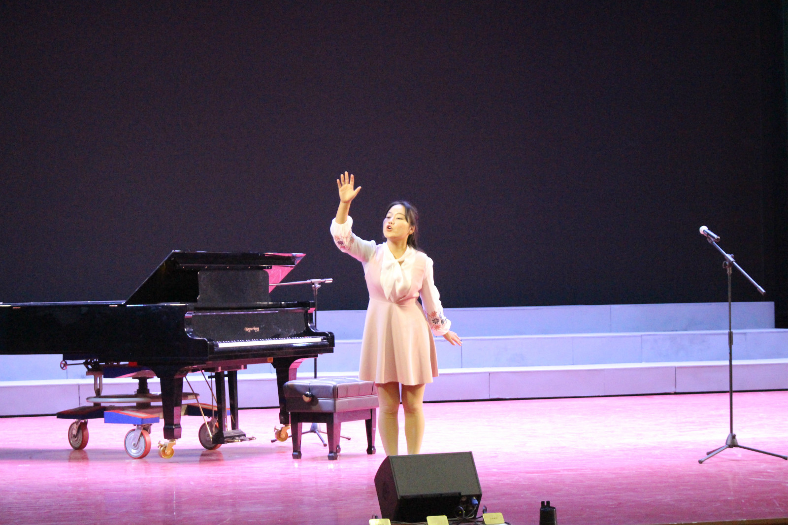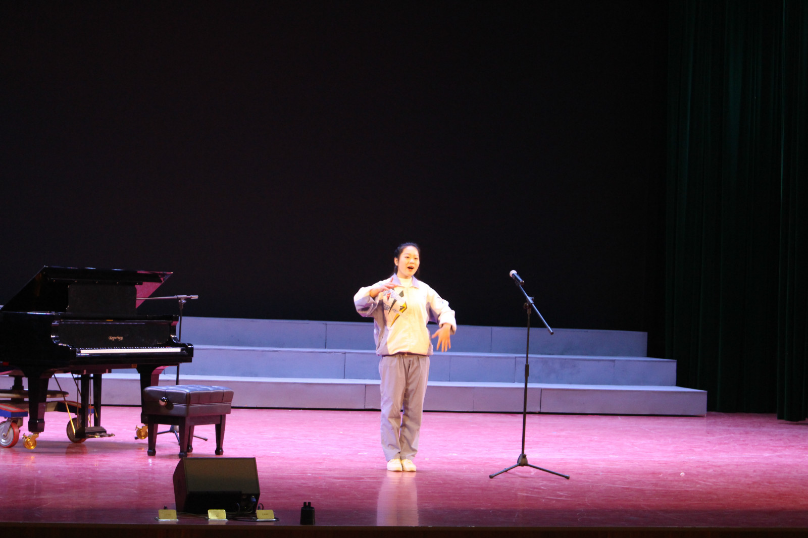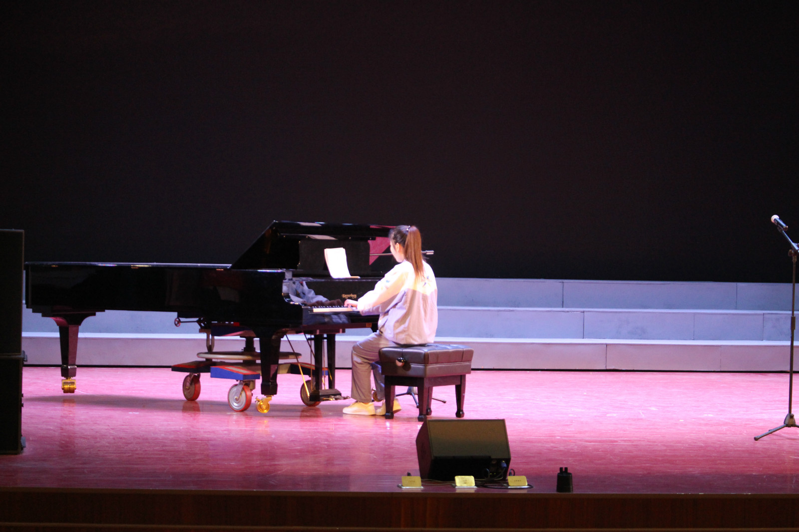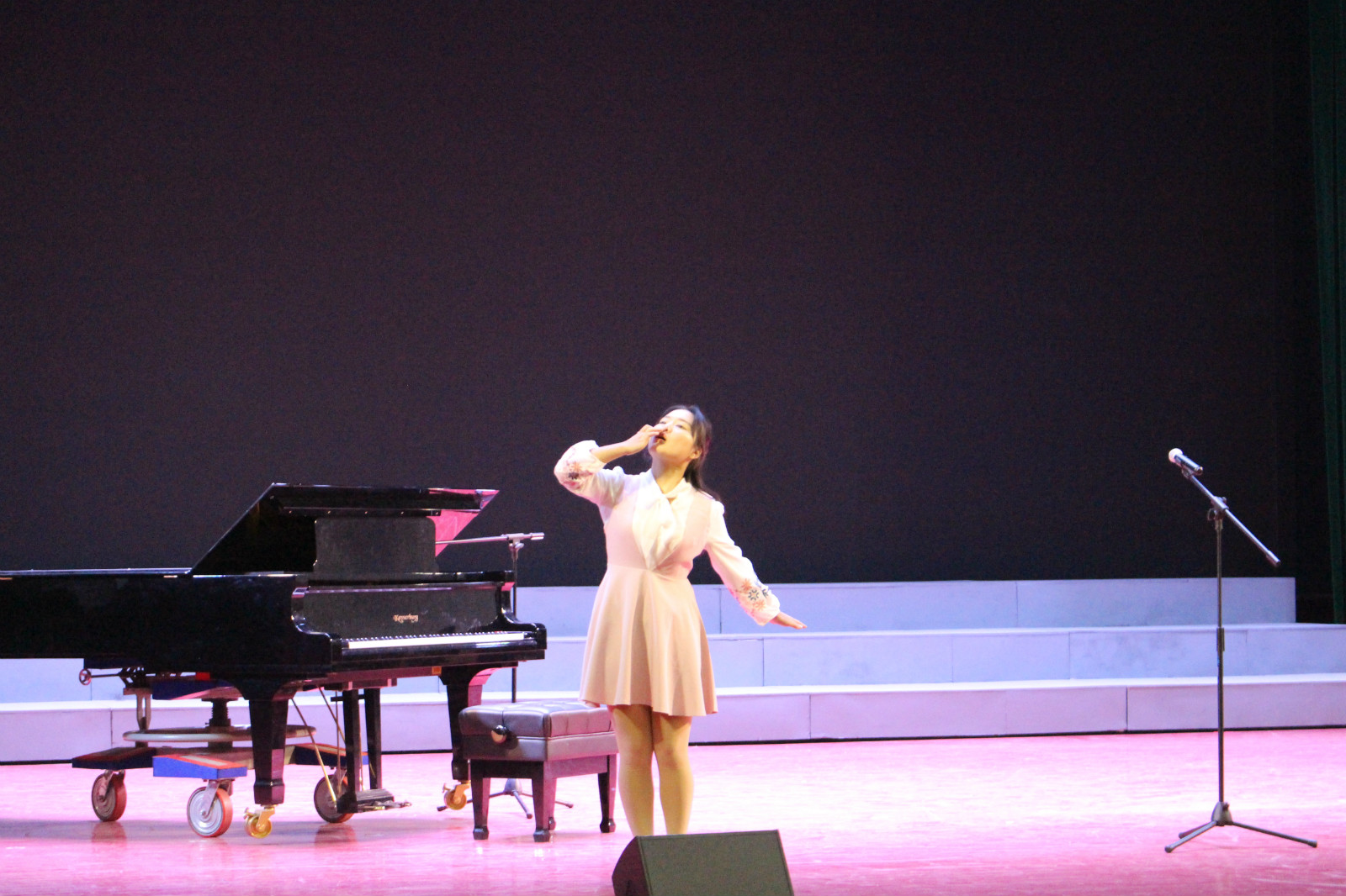 在大家期待的目光中,接下来为我们表演的是2号选手带来的钢琴演秦曲《小花猫和小老鼠》。随着二号选手灵活的手指在琴键上上下跳跃,优美的钢琴声在空中起伏;