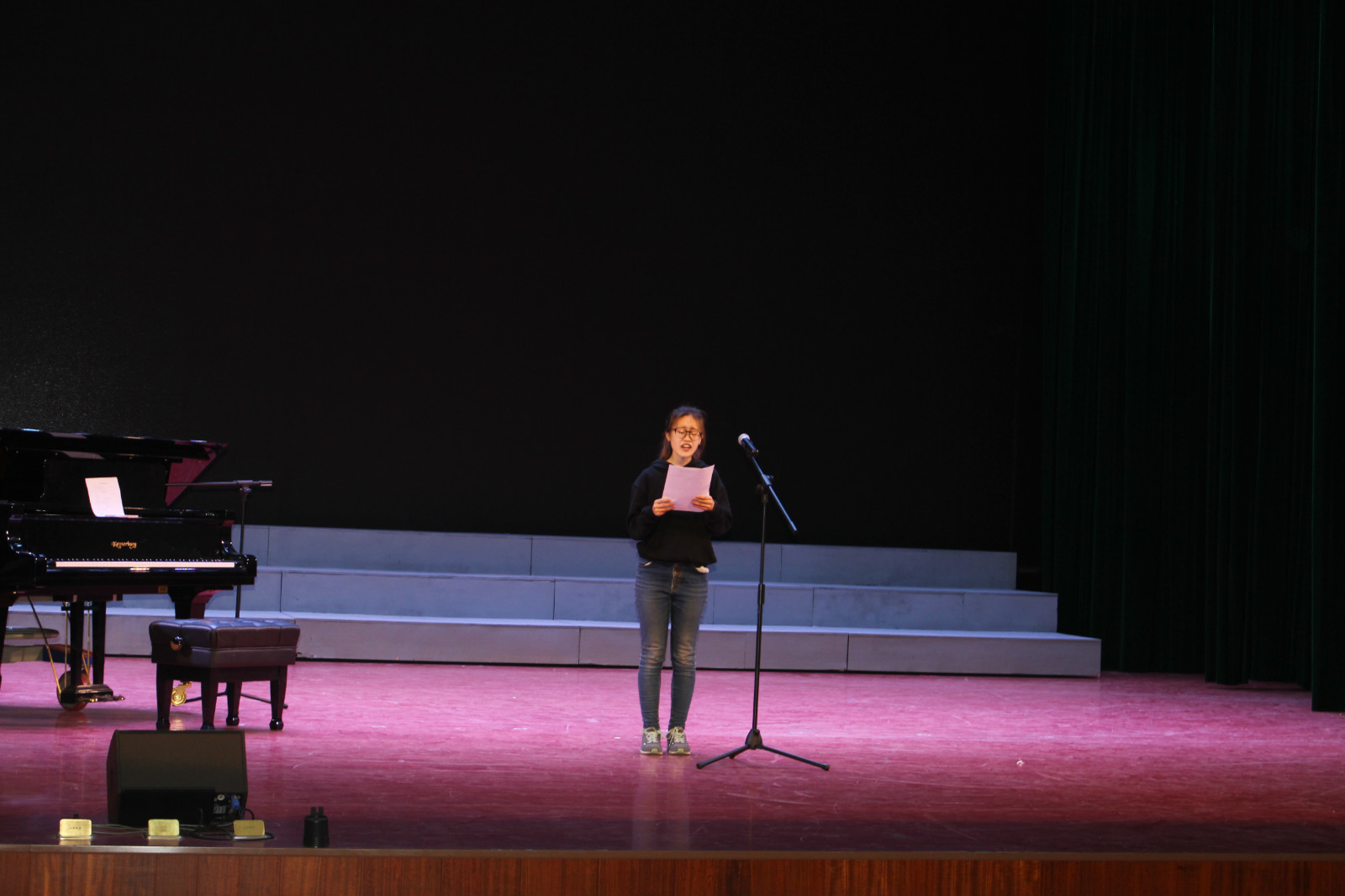 舞台上响起一阵悦耳的钢琴声,似山间涓涓细流,一个个音符跳跃着,表演开始了!首先表演的是一号选手,她为我们带来的是讲故事环节——《小猪变形记》。“从前有一只烦恼的小猪……”