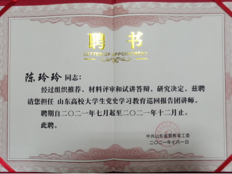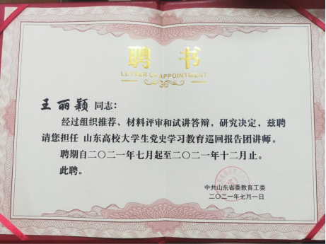 省委教育工委自2021年3月26日,向全省高校发出通知,组建山东高校大学生党史学习教育巡回报告团。经组织推荐、材料评审和试讲答辩,我校教师陈玲玲,学生王丽颖在144所高校中脱颖而出,光荣入选,成为全省39名师生报告团成员之一。下一步,她们将贯彻习近平总书记“七一”重要讲话精神,奔赴高校开展巡回宣讲活动。