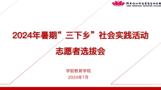 为全面贯彻落实习近平总书记关于青年工作的重要思想,积极响应学校暑期“三下乡”号召,进一步动员学前学子投身于乡村振兴,助推广大青年在暑期社会实践的“大思政课”中“受教育、长才干、作贡献”。7月3日,学前教育学院于阶梯六教室召开2024年暑期“三下乡”社会实践活动志愿者选拔会。参加本次选拔会的有学前教育学院学工办主任汉祥伟、团总支书记张晋、辅导员宋猛、李燕及学生代表。