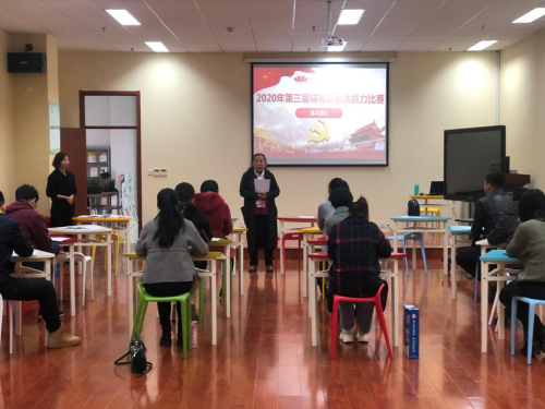 为深入学习宣传习近平新时代中国特色社会主义思想和党的十九大、十九届中央委员会第五次会议精神,全面贯彻落实全国高校思想政治工作会议精神和《普通高等学校辅导员队伍建设规定》要求,11月6日上午,我校第三届辅导员素质能力大赛正式拉开帷幕,学工处处长张敬霞出席大赛并担任初赛监考,全体专兼职辅导员参加比赛。