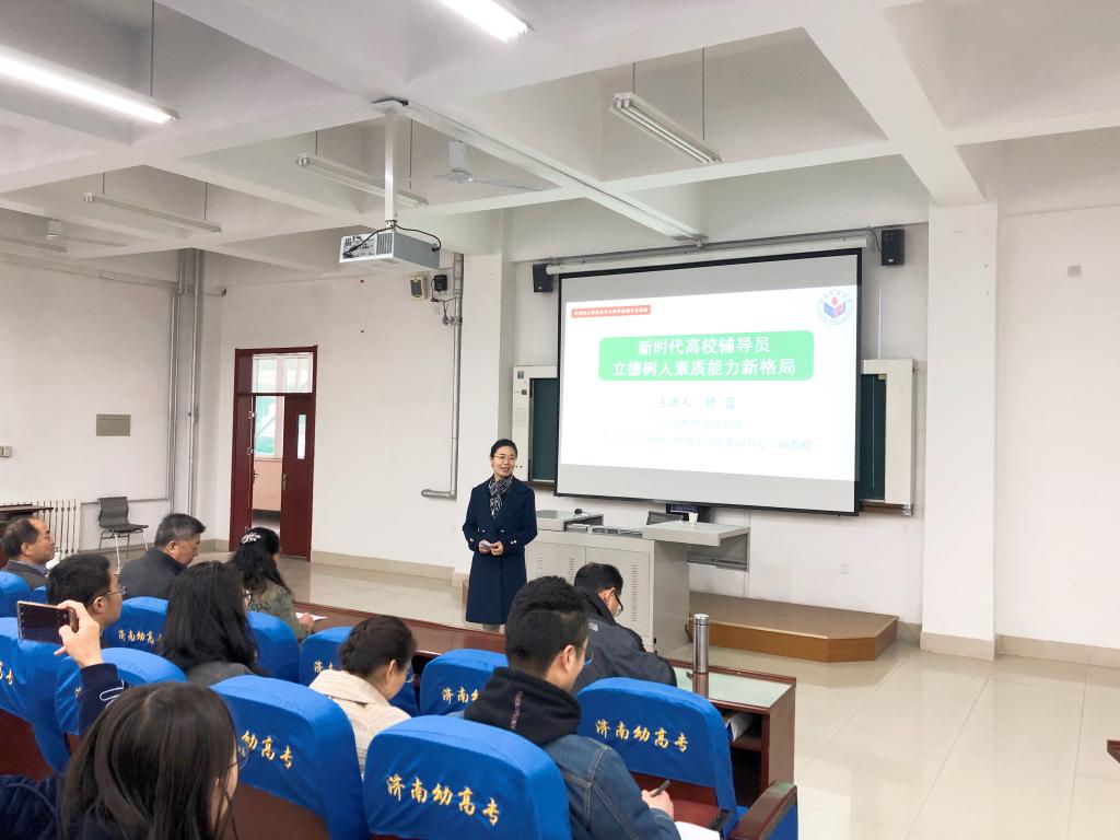 2019年3月29日上午,山东师范大学新闻与传媒学院党委副书记俢蕾副教授应邀在我校长清校区做了题为“新时代高校辅导员立德树人素质能力新格局”的专题报告。我校党委书记黄祖杰、副校长张传银、学工处处长张敬霞、各学院党委副书记、辅导员及班主任参加了此次报告会。会议由职业教育学院党委副书记侯艳红主持。