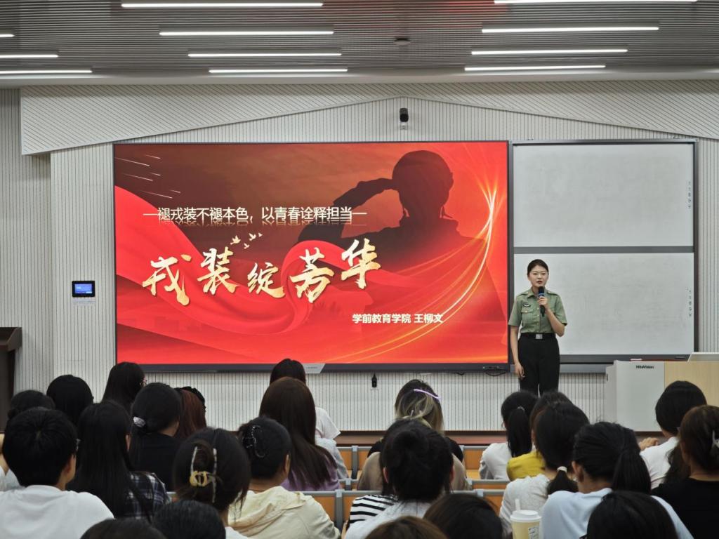 本次宣讲由学前教育专业大三学生、退役军人王柳文主讲,带领大家在一个个真实鲜活的军旅故事里,感悟青春的另一种可能。