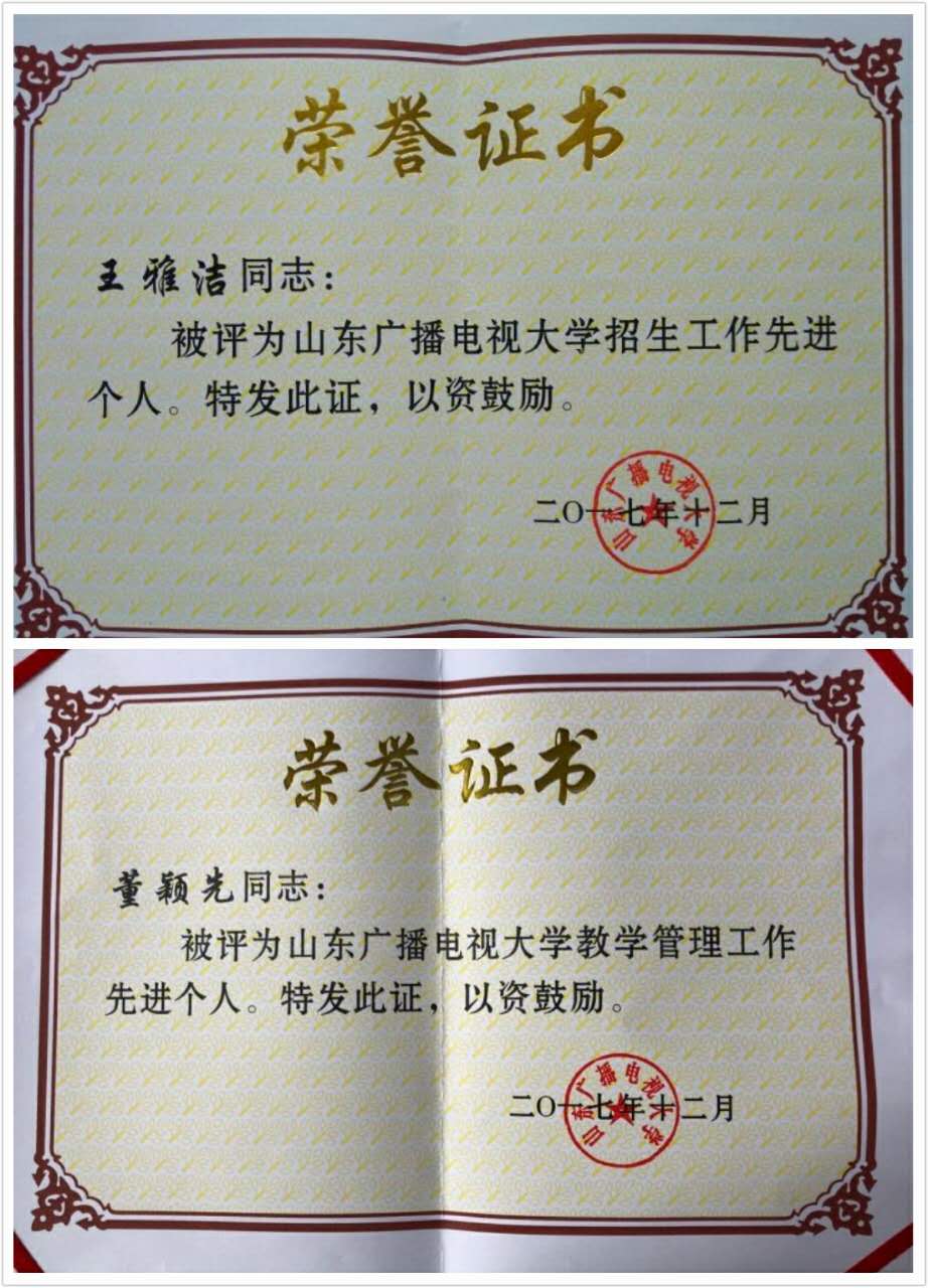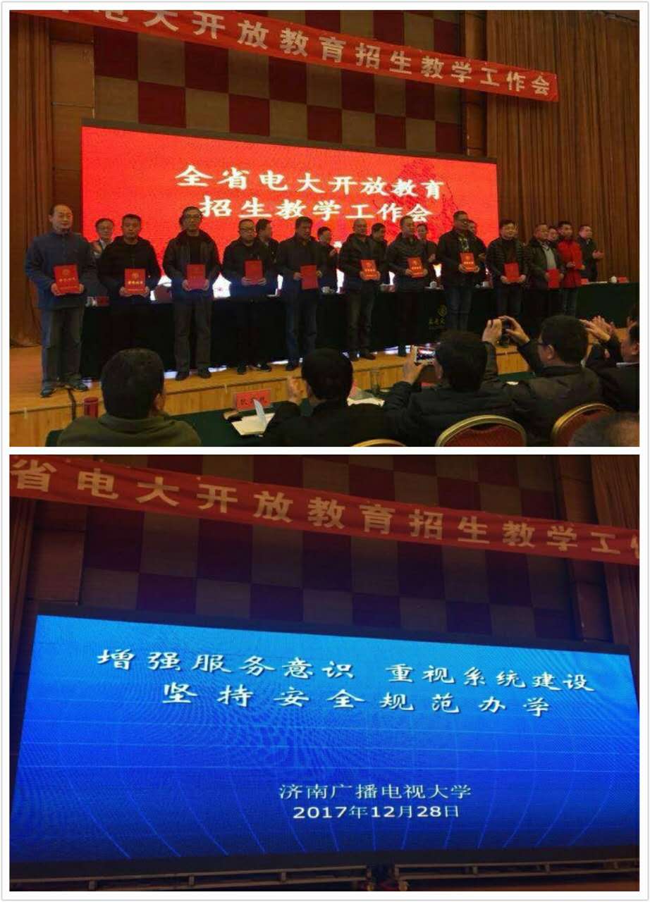 在2017年12月28日召开的全省电大招生教学工作会议上,我校章丘电大分校荣获全省电大招生工作先进集体荣誉称号,长清分校荣获全省电大教学管理先进集体荣誉称号,王雅洁等4人荣获全省电大招生工作先进个人荣誉称号,董颖先等5人荣获全省电大教学管理工作先进个人荣誉称号。