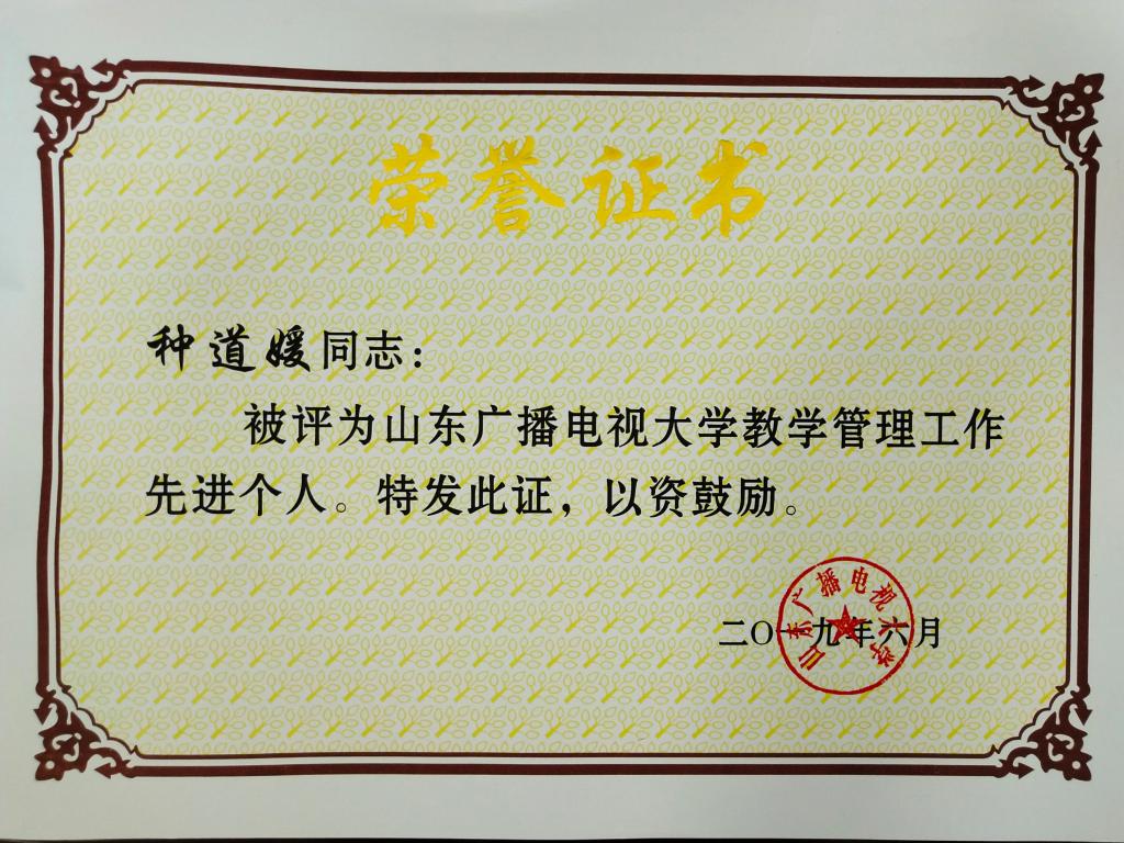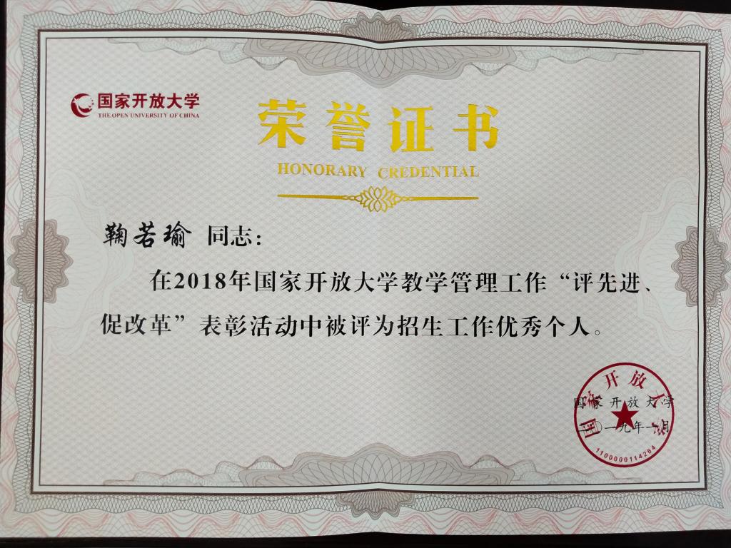 远程教育学院获得山东广播电视大学授予的“全省电大招生工作先进集体”,鞠若瑜老师获得国家开放大学招生工作先进个人,种道媛老师获得山东广播电视大学教学管理工作先进个人。