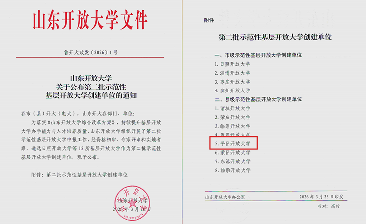 近日,山东开放大学发布了《关于公布第二批示范性基层开放大学创建单位的通知》(鲁开大政发〔2026〕1号),公布了全省第二批示范性基层开放大学创建单位名单,我校平阴分校(平阴开放大学)成功入选。