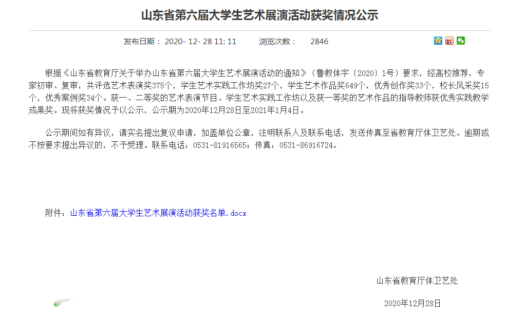 近日,山东省第六届大学生艺术展演活动评选结果揭晓,我校获得“优秀组织奖”。山东梆子《辞亲状别》获优秀创作奖;优秀案例获一等奖1个;艺术表演类节目报送6个,获得一等奖4个,二等奖1个,三等奖1个;艺术作品类,绘画作品获一等奖2个,二等奖2个,三等奖5个;书法篆刻作品获一等奖4个,二等奖2个;艺术工坊获三等奖。