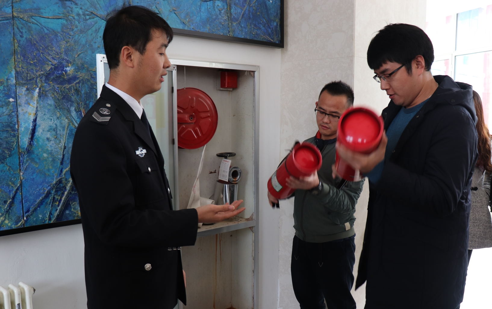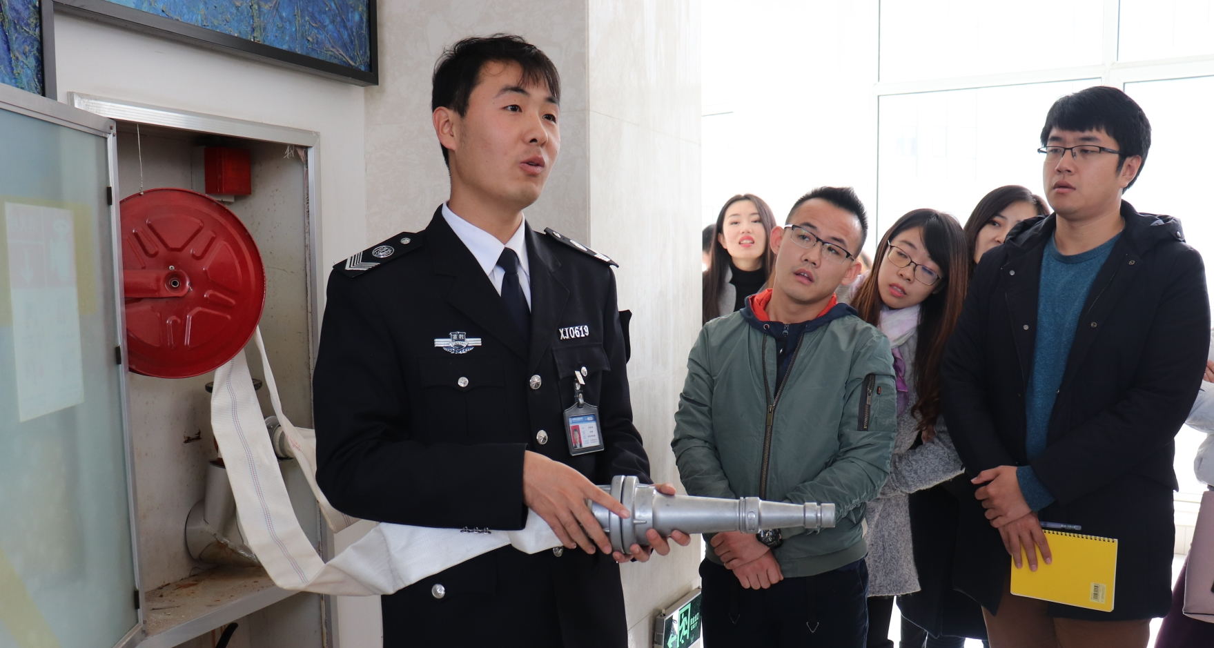 讲座结束后,吴警官邀请师生跟随他到艺术楼一楼大厅学习如何使用消防器材。大家开始模拟练习使用灭火器、消防栓。进一步与吴警官交流,提出自己疑惑,吴警官也为大家积极解答问题。