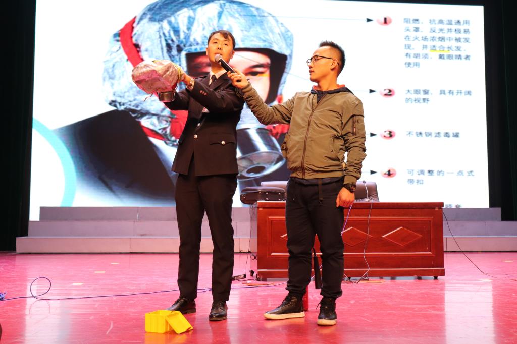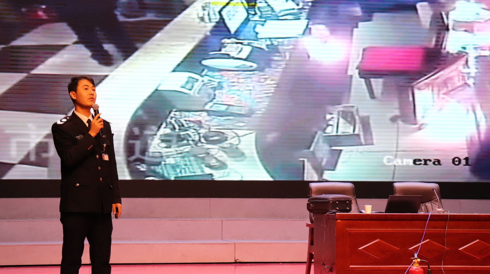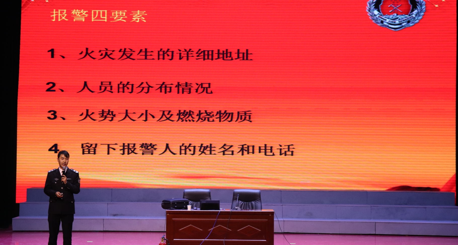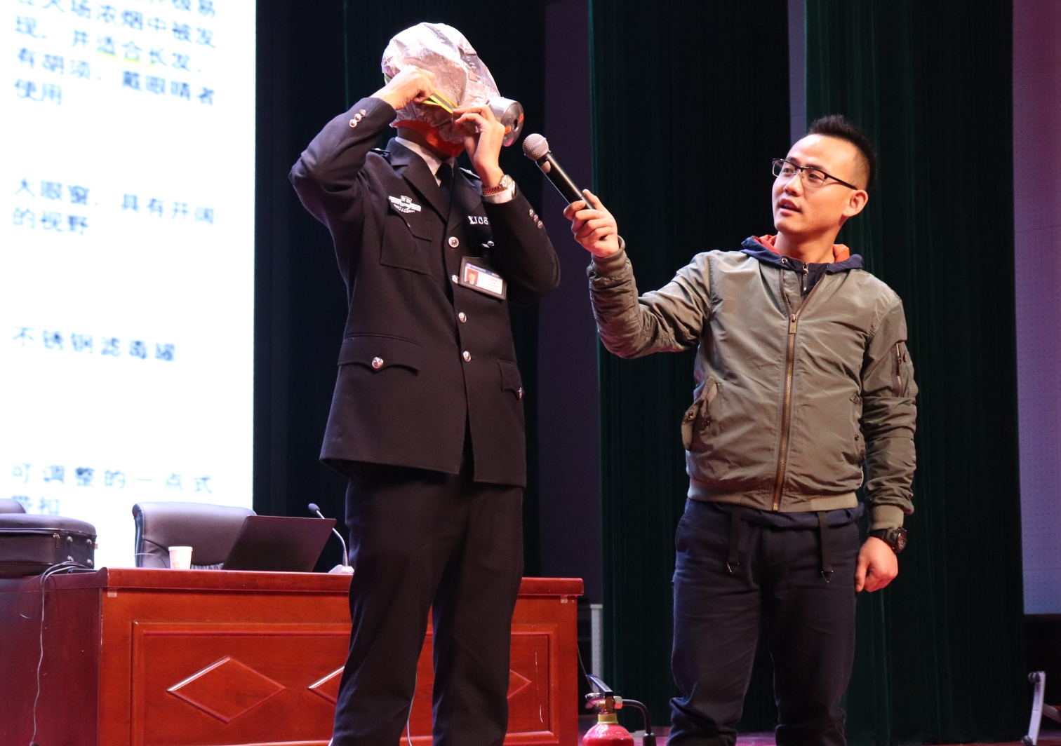 会议开始,吴警官为大家播放了一场火灾的案例,让大家明白消防安全的重要性,接着为大家讲解日常中火灾发生原因:电器老化、超负荷使用、电器撕拉、手机充电等。接下来吴警官告诉大家拨打火灾报警电话时要注意留下火灾发生的具体地址、火灾燃烧的物品、受灾人数、联系电话等。随后吴教官为大家播放了几组关于火灾受伤人员及其现场照片和视频,一幕幕触目惊心的画面令大家极其震撼。吴警官告诉大家火灾发生初始期应尽快灭火,发展期要尽快逃生,逃生的时候,楼上着火要往下跑,楼下着火要顺着楼梯往下跑。逃跑时要谨记:不跳楼、不乘电梯、保持冷静;煤气罐着火应该先灭火再关气;油锅内着火时不能浇水,要用灭火毯;车内着火,若被困应该通过砸玻璃逃生。吴警官为大家讲解了自救呼吸器的使用方法,并且告诉大家住宾馆的时候一定要在房间检查是否有自救呼吸器,若没有可以拨打96119火灾隐患报警电话。最后吴警官为大家讲解了灭火器的具体使用。